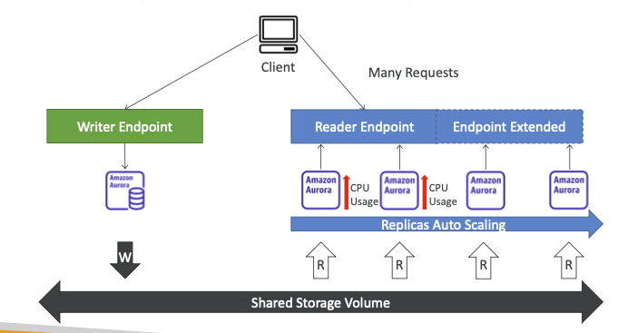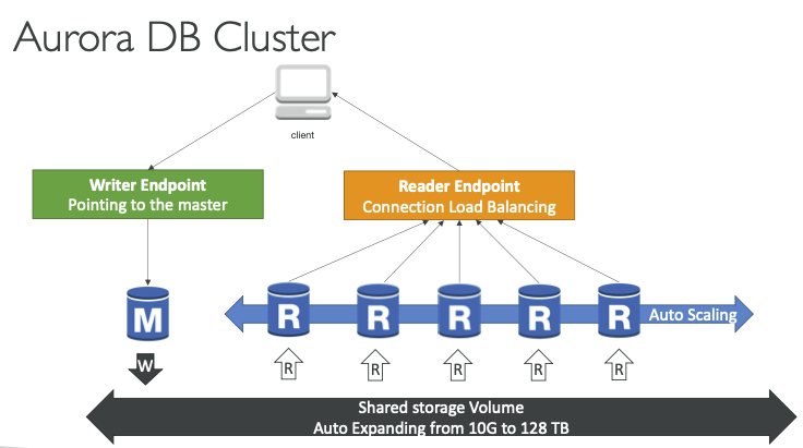 - Aurora DB 클러스터도 15개의 Aurora 읽기 전용 복제본을 가질 수 있다