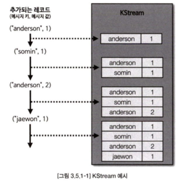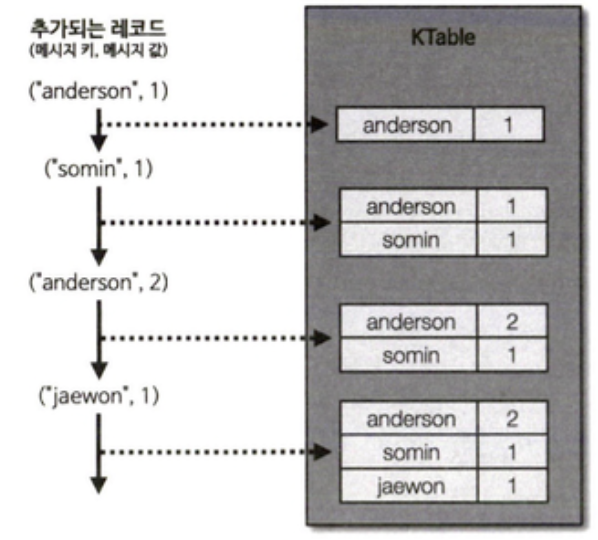 다음으로 KTable과 KStream을 함께 사용하는 경우에 대해 알아보자. KTable과 KStream 은 메시지 키를 기준으로 조인할 수 있다. 대부분의 데이터베이스는 정적으로 저장된 데이터 를 조인하여 사용했지만 카프카에서는 실시간으로 들어오는 데이터들을 조인할 수 있다. 예를 들어, 이름을 메시지 ヲI, 주소를 메시지 값으로 가지고 있는 KTable이 있고 이름을 메시지 키, 주문한 물품을 메시지 값으로 가지고 있는 KStream이 존재한다고 가정하자. 사용자가 물품을 주문하면 이미 토픽에 저장된 이름:주소로 구성된 KTable과 조인하여 물품과 주소가 조합된 데이터를 새로 생성할 수 있다. 사용자의 이벤트 데이터를 데이터베이스에 저장하지 않고도 조인하여 스트리밍 처리할 수 있다는 장점이 있다. 이를통해 이벤트 기반 스트리밍 데이터 파 이프라인을 구성할 수 있는 것이다.