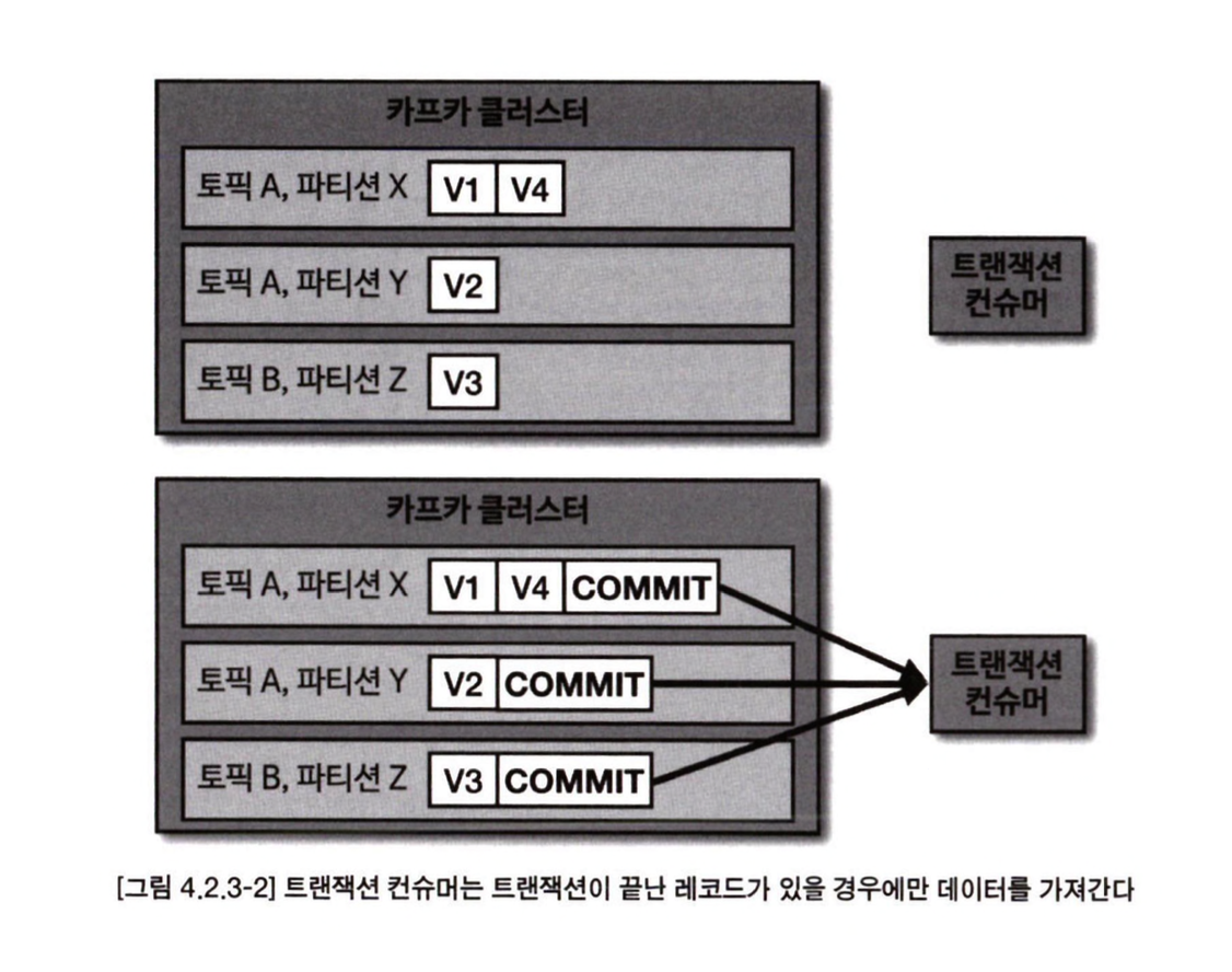 트랜잭션 프로듀서를 사용하려면 enable.iclempotence 를 true로 설정하고 transactional.id를 임의의 String값으로 정의한다. 그리고 컨슈머의 isolation.level을 read_committed로 설정하면 프로듀서와 컨슈머는 트랜잭션으로 처리 완료된 데이터만 쓰고 읽게 된다.