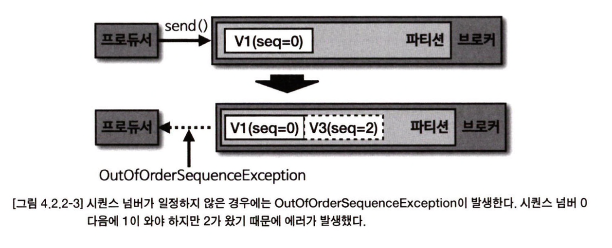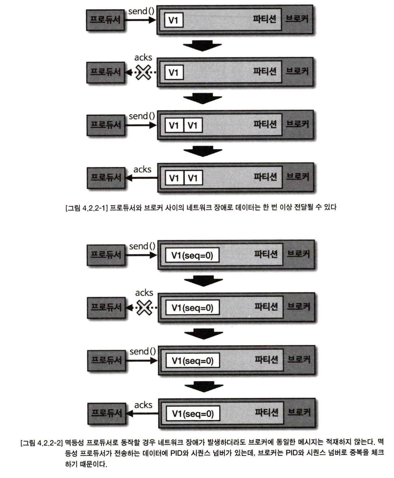 동일한 데이 터를 보내더라도 PID가 달라지면 브로커 입장에서 다른 프로듀서 애플리케이션이 다른 데이 터를 보냈다고 판단하기 때문에 멱등성 프로듀서는 장애가 발생하지 않을 경우에만 정확히 한 번 적재하는 것을 보장한다는 점을 고려해야 한다.