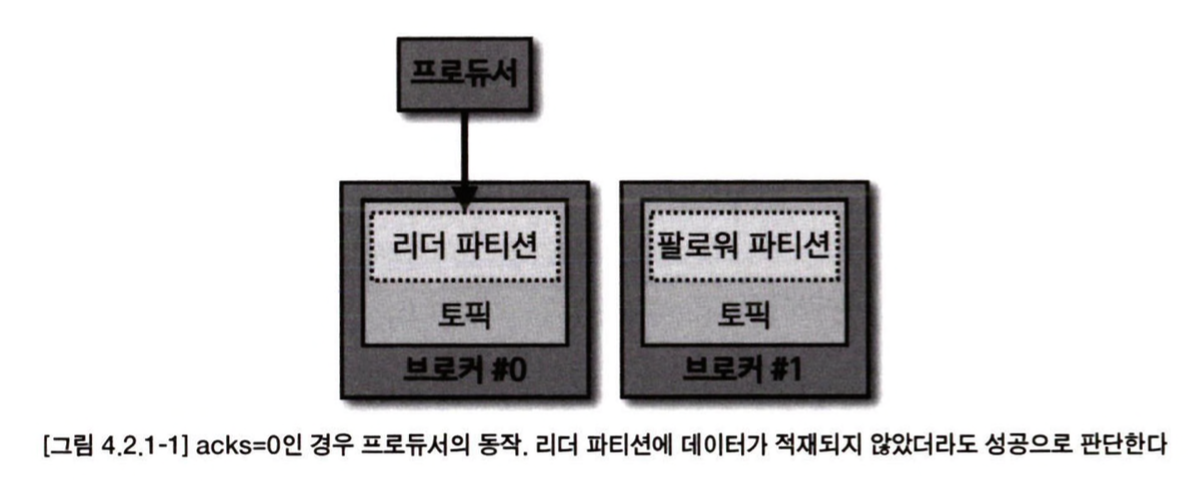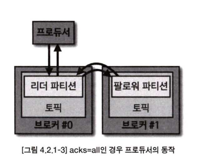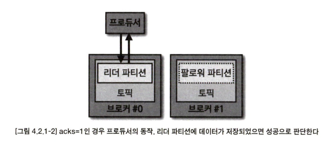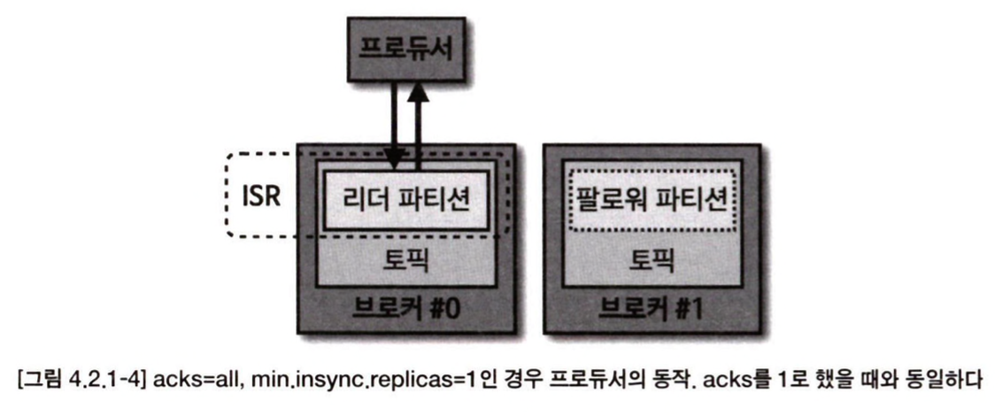 가 적재되었는지 확인하기 때문에 0 또는 1 옵션보다도 속도가 느리다. 그럼에도 불구하고 팔 로우 파티션에 데이터가 정상 적재되었는지 기다리기 때문에 일부 브로커에 장애가 발생하더 라도 프로듀서는 안전하게 데이터를 전송하고 저장할 수 있음을 보장할 수 있다.