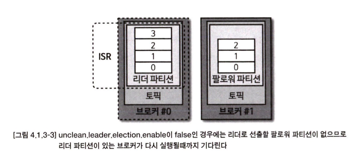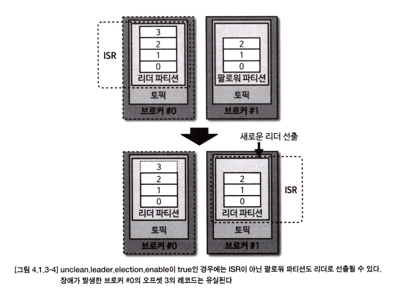 션을 리더 파티션으로 선출 가능한지 여부를 선택하기 위해서는 unclean.leader.election. enable 옵션을 false 또는 true로 설정하면 된다. false로 설정할 경우에는 ISR이 아닌 팔로워 파티션을 리더 파티션으로 선출하지 않는다.