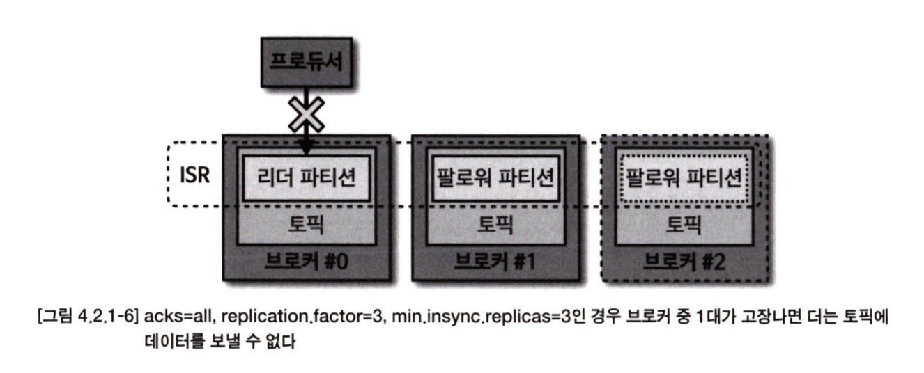 2)이 생기는 것을 만족할 수 있기 때문이다. 그러므로 토픽별 min.insync.replicas 옵션값은 브로커 개수 미만으로 설정해서 운영해야 한다.