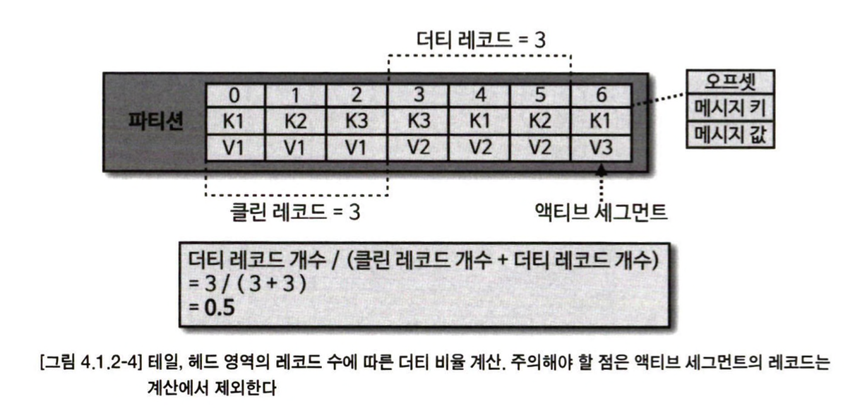 '더티 비율(dirty ratio)'은 더티 영역의 메시지 개수를 압축 대상 세그먼트에 남아있는 데이터 의 총 레코드 수(더티 영역 메시지 개수+클린 영역 메시지 개수)로 나눈 비율을 뜻한다. 만약