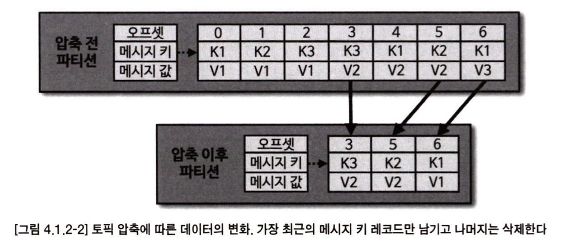 압축: 메세지 키별로 해당 메세지 키의 레코드 중 오래된 데이터를 삭제하는 정책