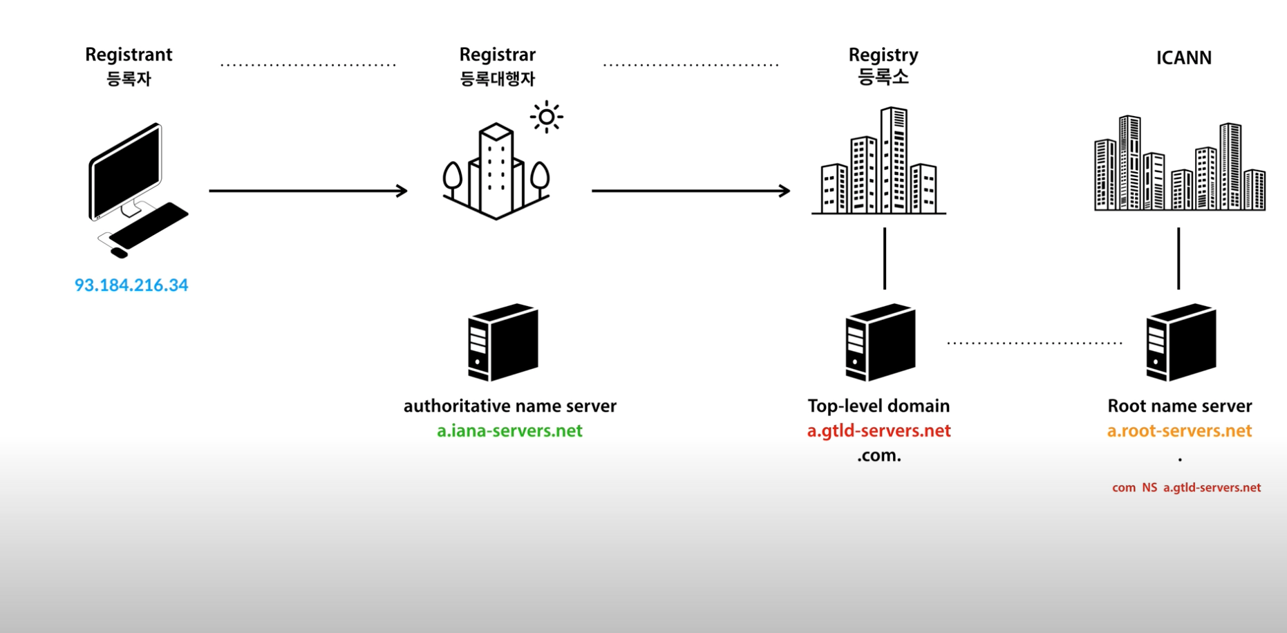 - 등록 대행자는 등록소(Registry)를 통해 도메인 이름을 등록합니다.