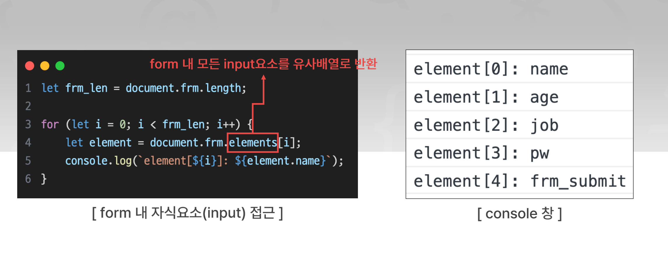 ⭐️ form 태그 안에 모든 입력요소에 진입 👉 elements