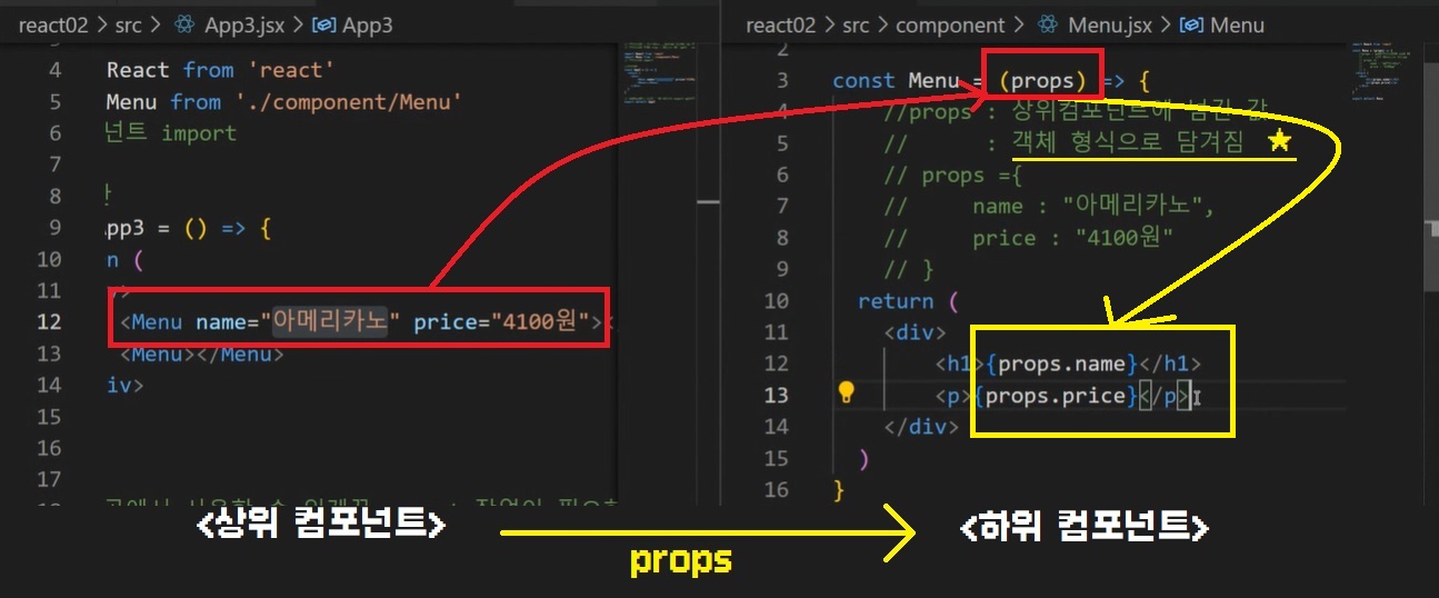 3) <Menu name="아메리카노" price="4100원"></Menu> 👉 전달할 값 작성