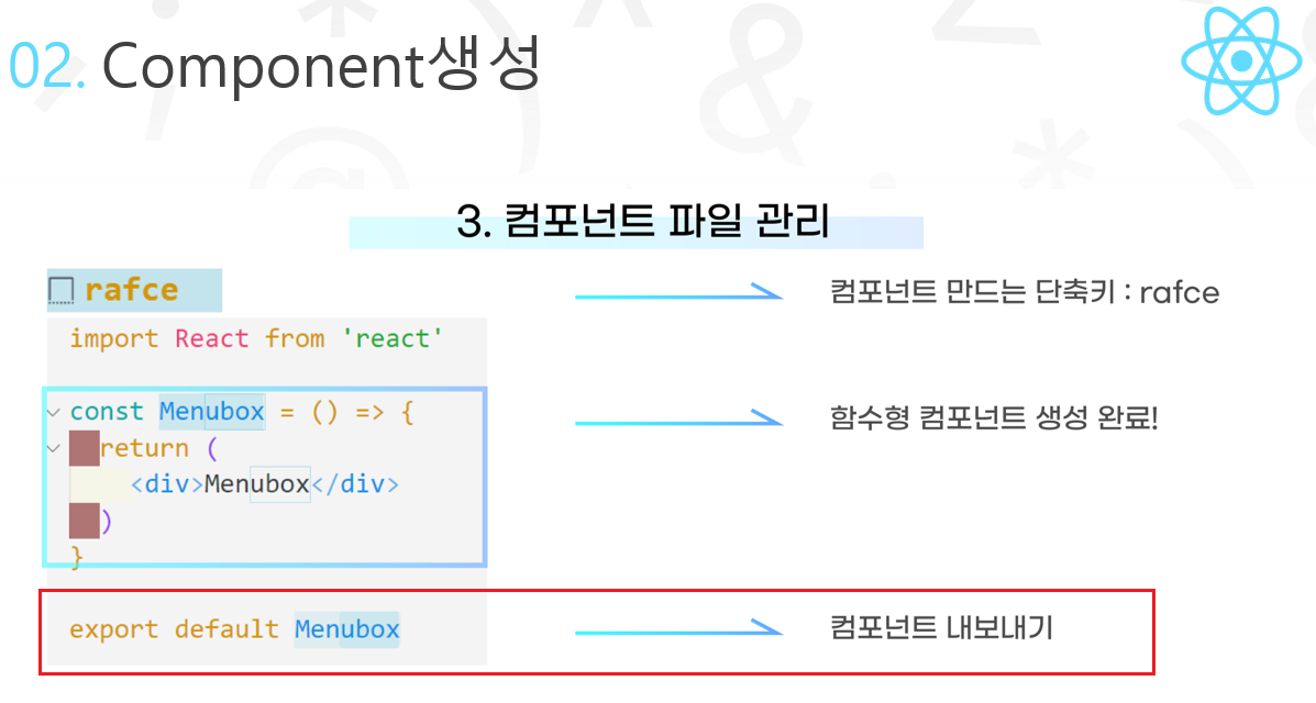 - rafce : 확장자 설치 후, 간편하게 함수 자동완성 단축어