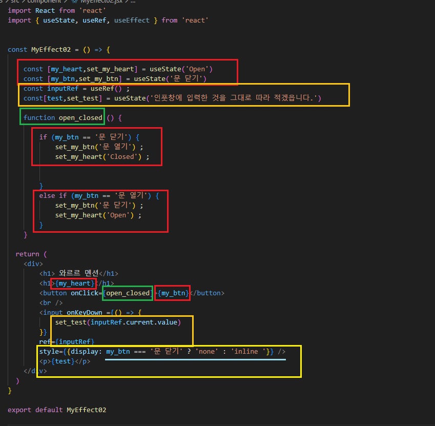 🟨 노란박스 : 인풋 요소 값 접근(useRef) + 인풋 값 갱신 (useState)