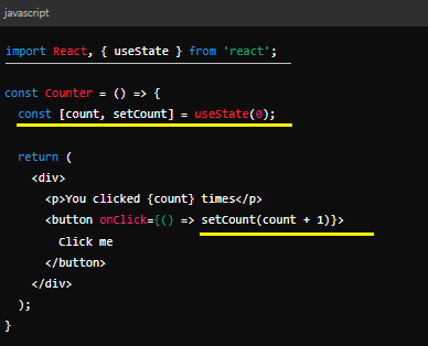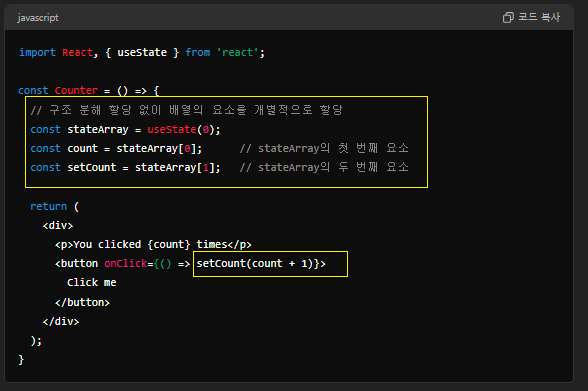 const [ 기본값 , 셋팅값 ] = useState(초기값) ;