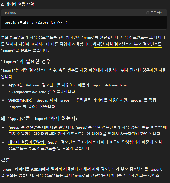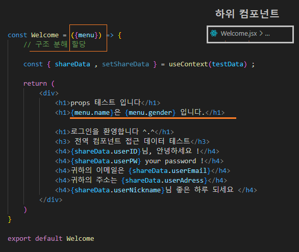 ② 'Welcome'은 전달 받은 데이터만 사용해서, 필요 ❌❌
