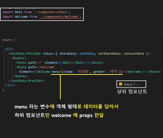 - 상위 컴포넌트 App.js 中 , Route 안에 props 전달