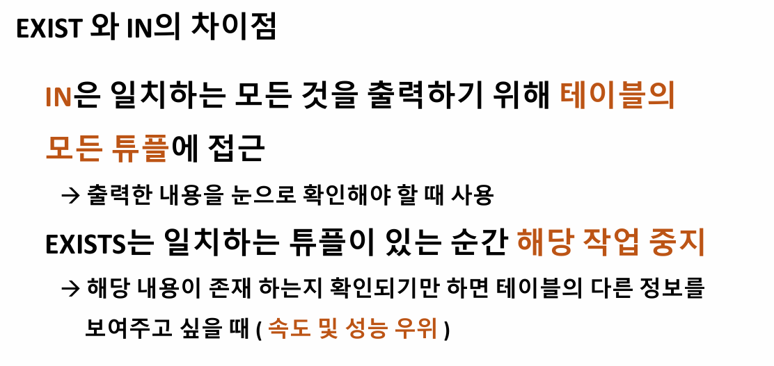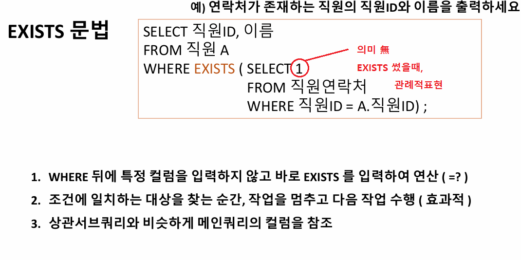EXISTS : 데이터 조회 되면 / 바로 다음 작업