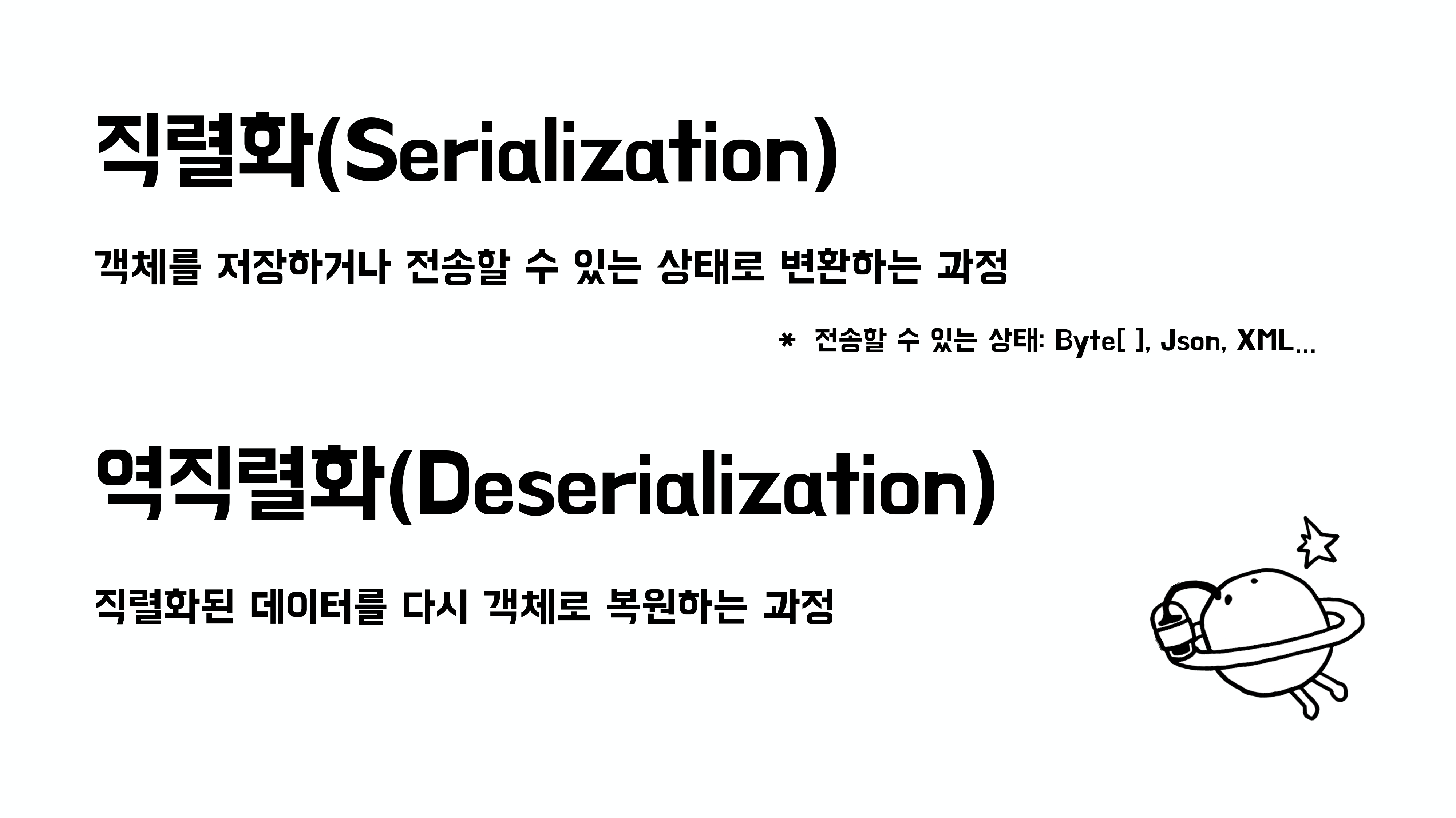 먼저 간단하게 직렬화와 역직렬화가 무엇인지 설명해보자면, 직렬화란 Java 객체를 JSON, XML, 혹은 바이트 배열과 같이 저장하거나 전송할 수 있는 상태로 변환하는 과정이다. 이 과정을 통해 객체를 파일로 저장하거나 네트워크를 통해 전달할 수 있게 된다.