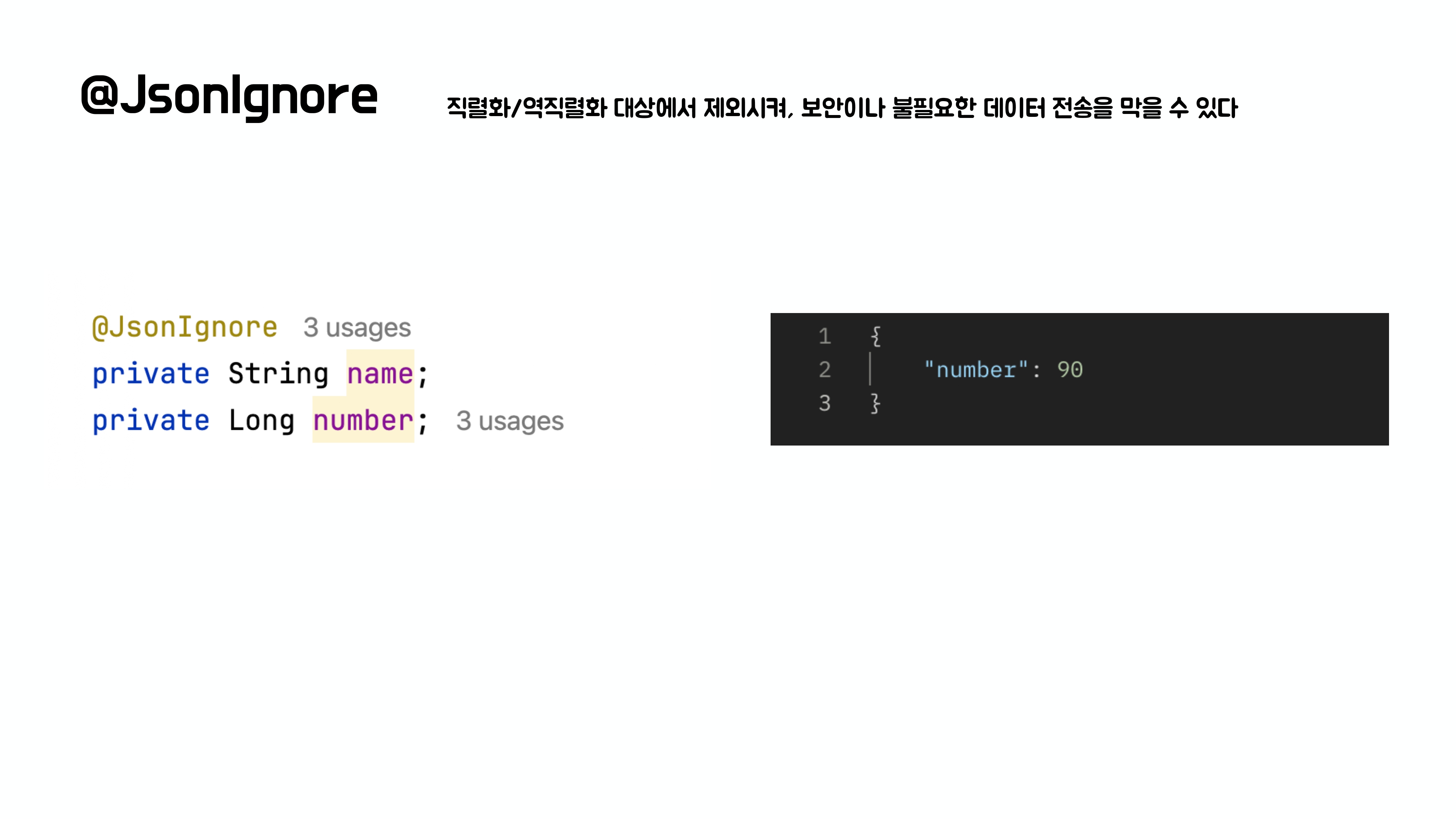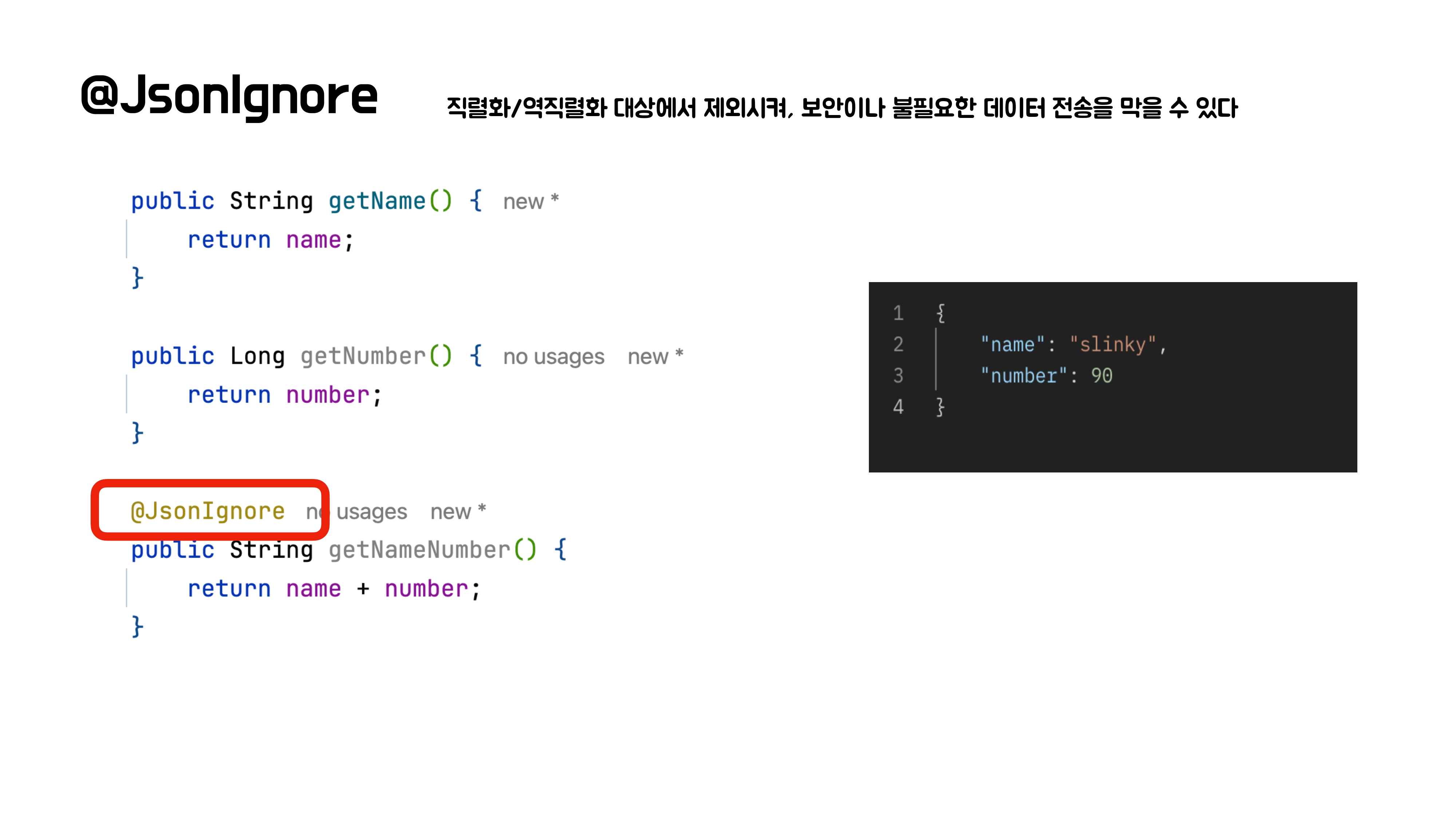 이때 메서드 위에 @JsonIgnore라는 어노테이션을 붙여주게 된다면 해당 메서드는 직렬화 되는 과정에서 제외된다.