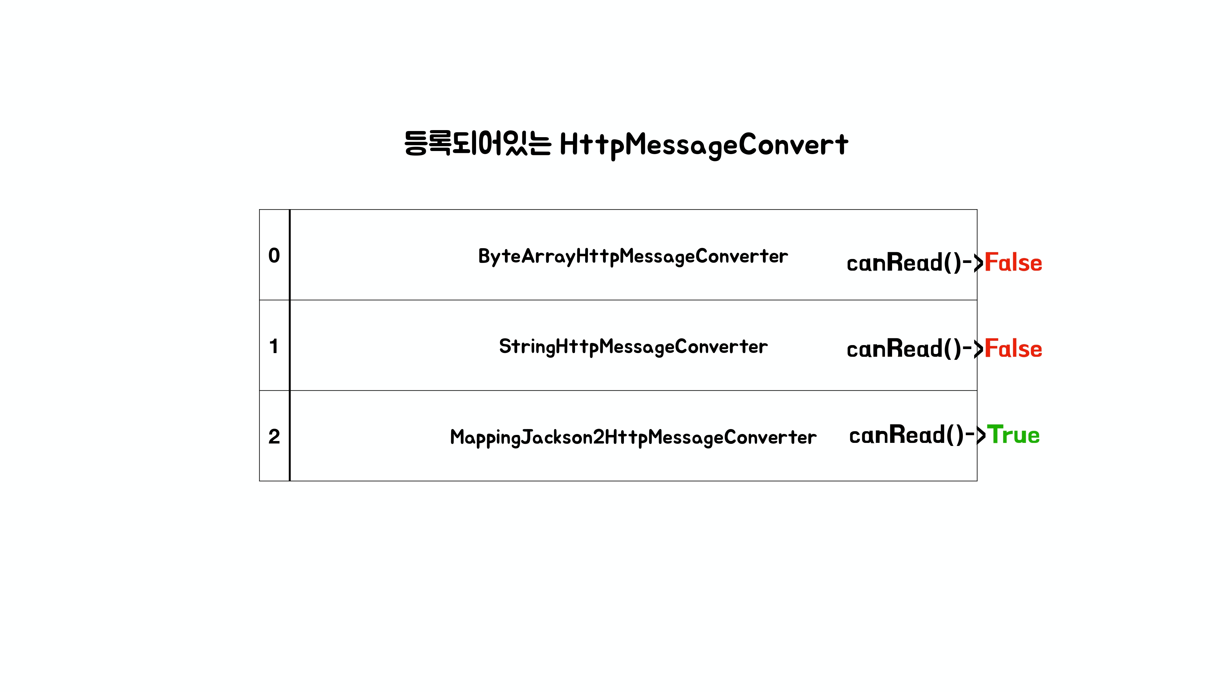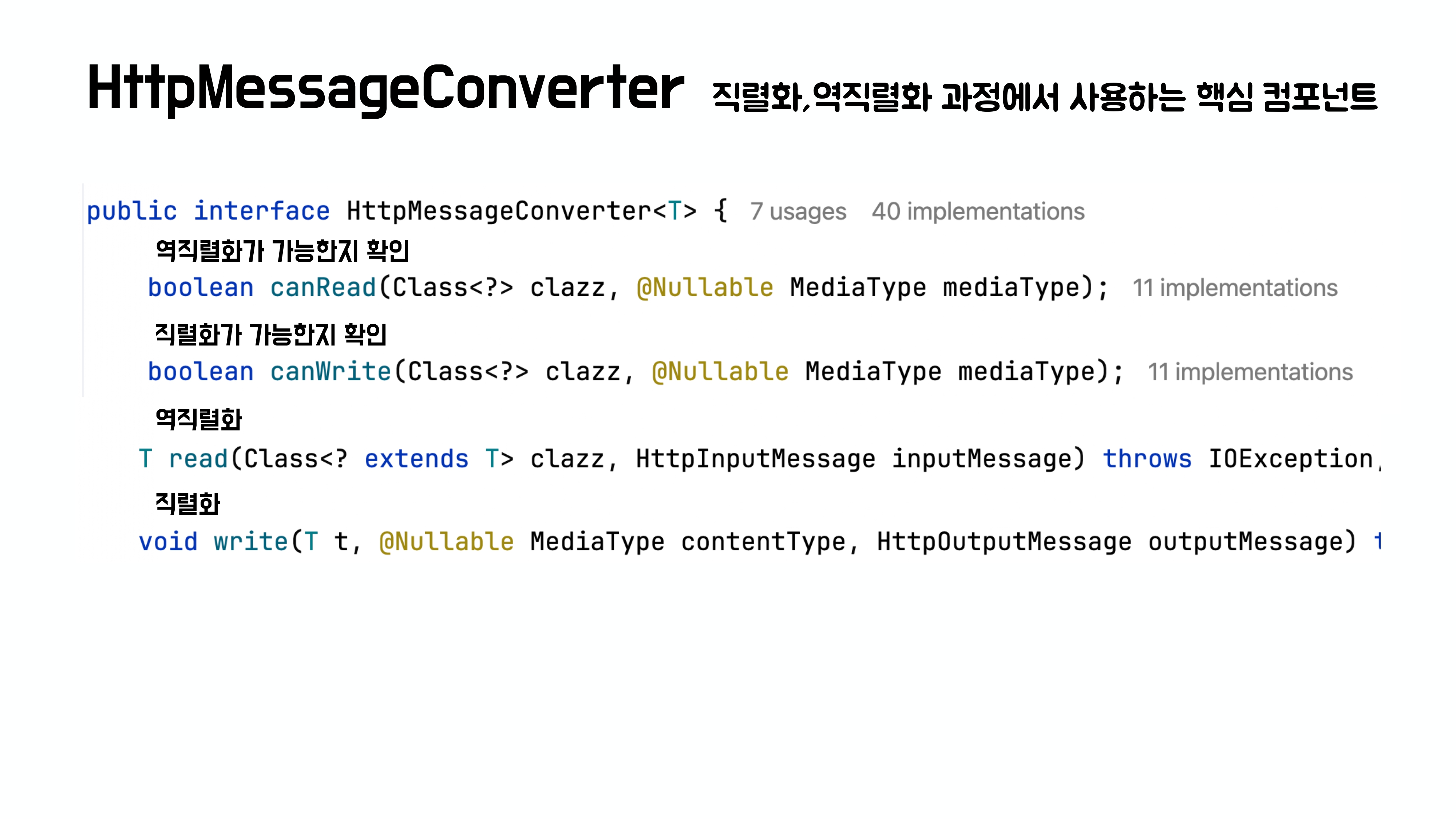 canRead() / canWrite(): 특정 클래스와 MediaType(예: application/json)에 대해 읽기/쓰기 가능한지 boolean 값으로 반환한다.read() / write(): 실제로 객체를 읽거나 쓰는 동작을 수행한다.