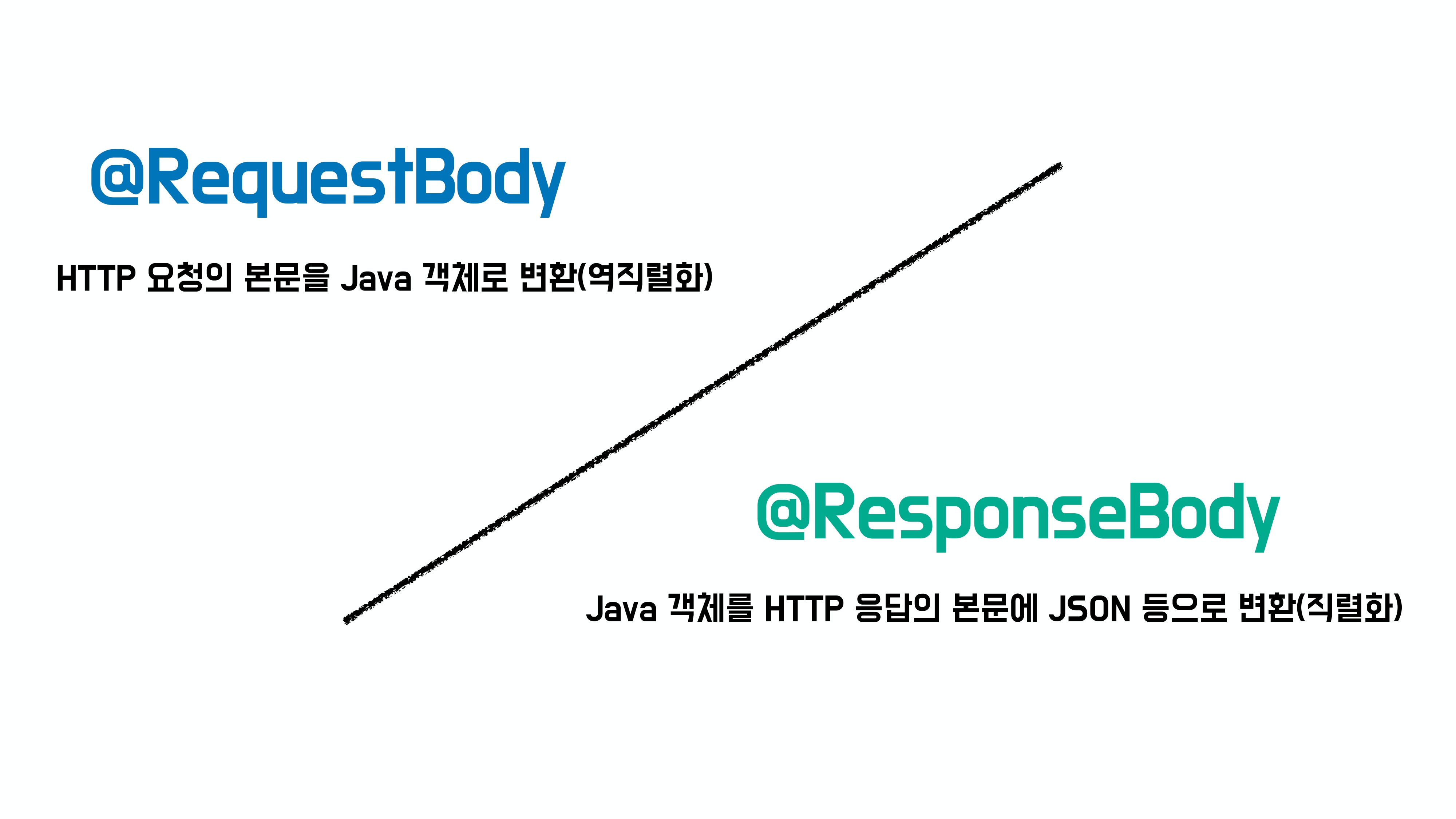 예를 들어, @RequestBody는 HTTP 요청의 본문을 Java 객체로 변환해야 할 때 사용하고, @ResponseBody는 그 반대로 Java 객체를 HTTP 응답 본문으로 직렬화할 때 사용한다.