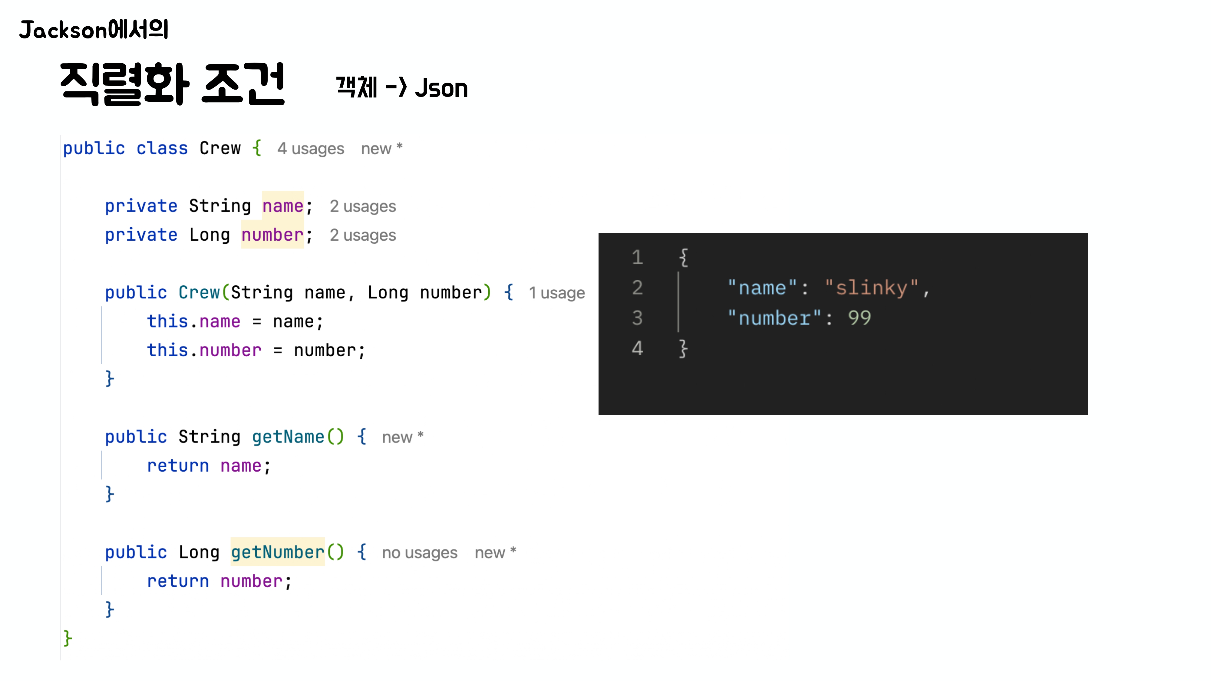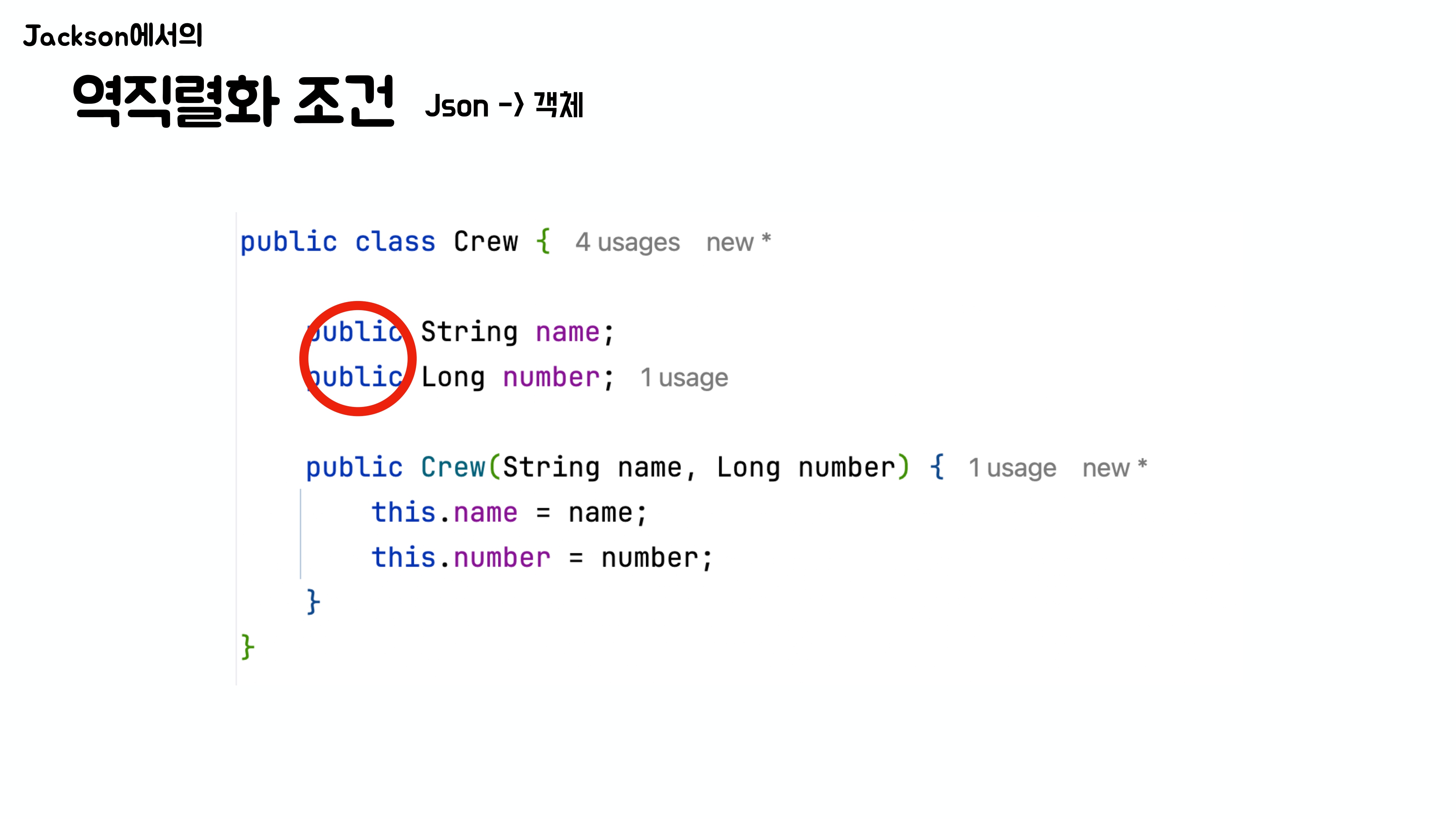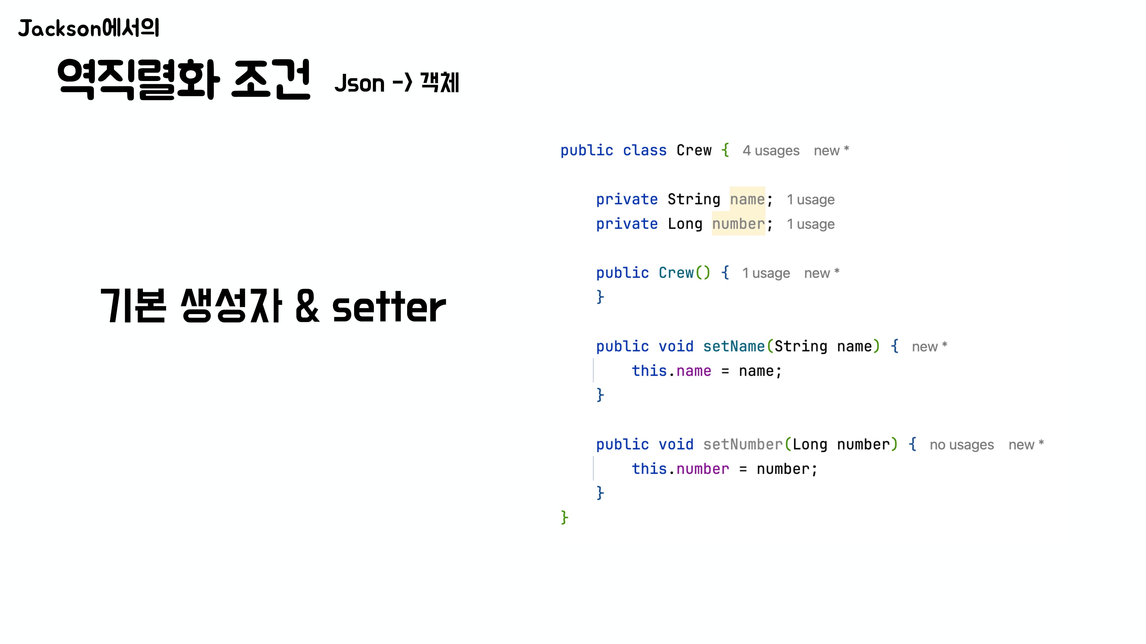 하지만 일반적으로는 필드를 private으로 선언하기 때문에, 이 경우 Jackson은 기본 생성자로 객체를 만든 뒤, setter 메서드를 통해 값을 주입한다.