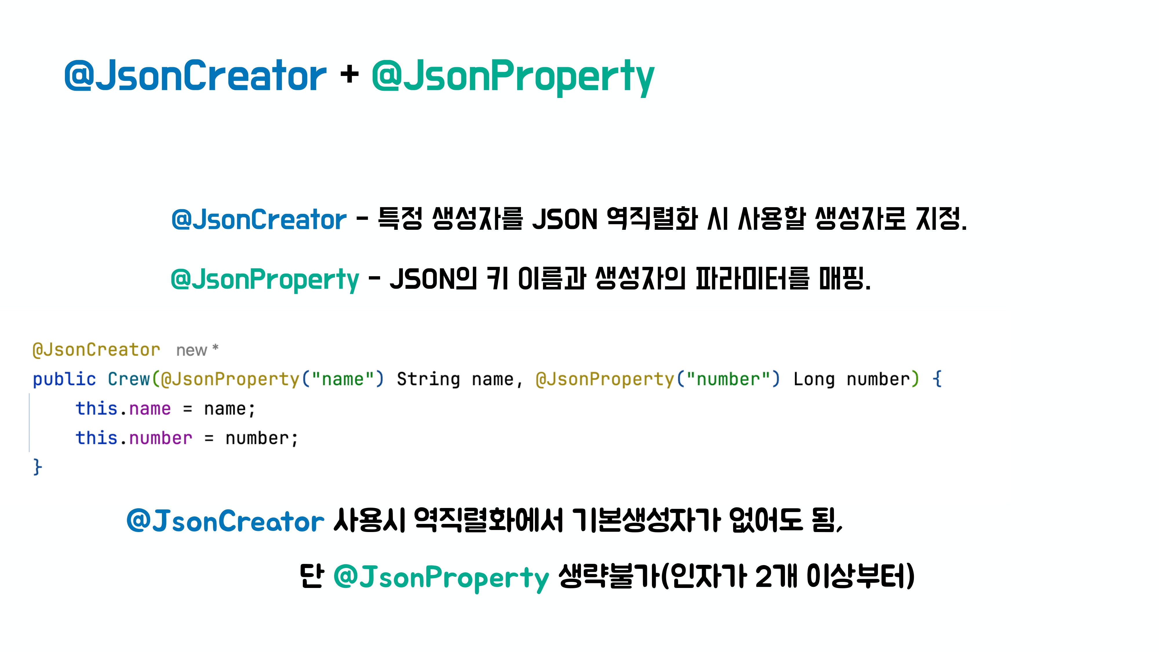 따라서 기본 생성자가 없어도 된다. 이때 인자가 2개 이상이 된다면 @JsonProperty를 명시해주어야한다. Json의 키 이름과 생성자의 파라미터를 매핑 해줌으로써 역직렬화를 구체적으로 알려주는 것이다.