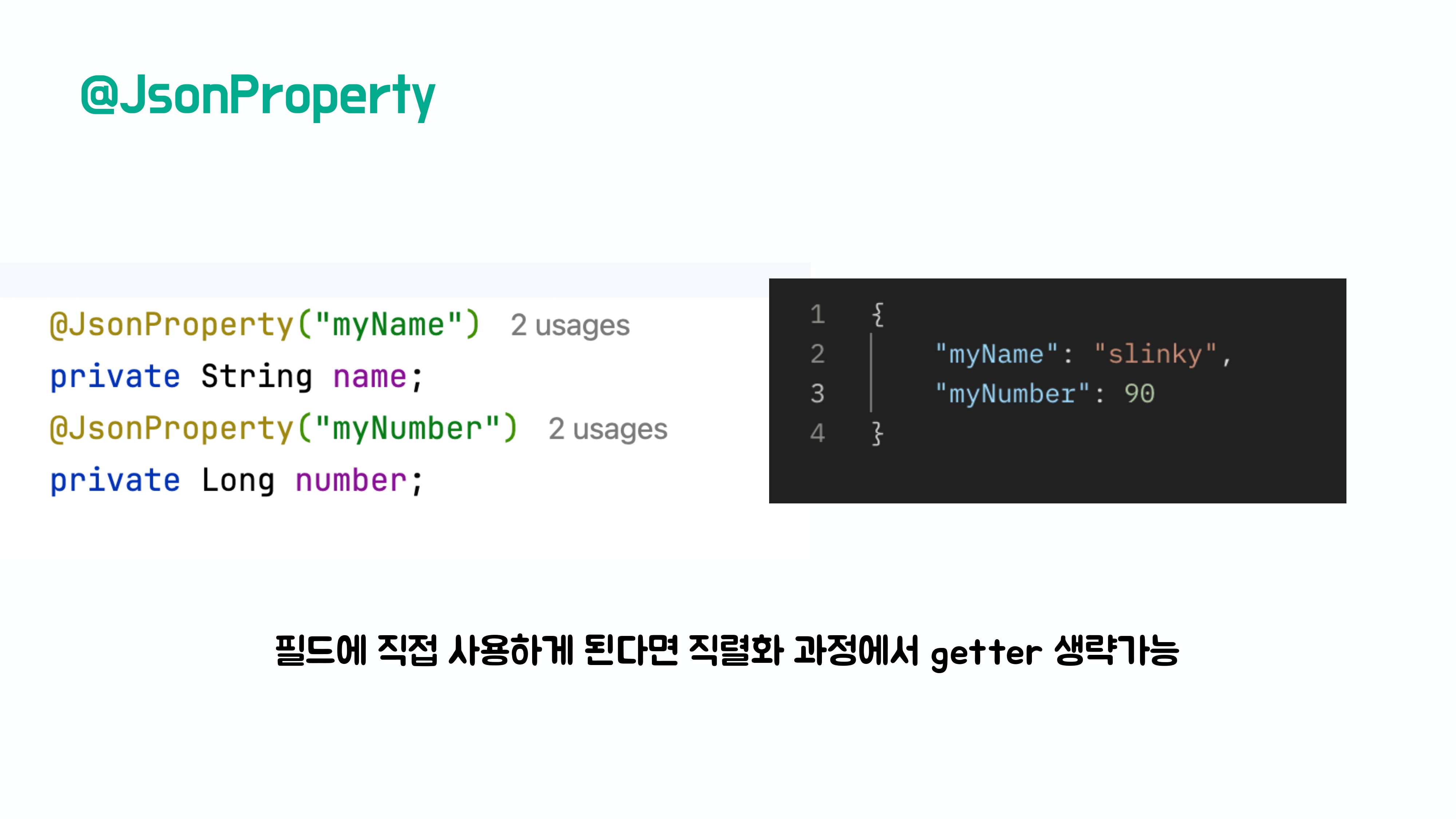 @JsonProperty 역시 필드에도 사용이 가능한데 이 경우에는 getter가 생략되어도 직렬화가 가능해진다.