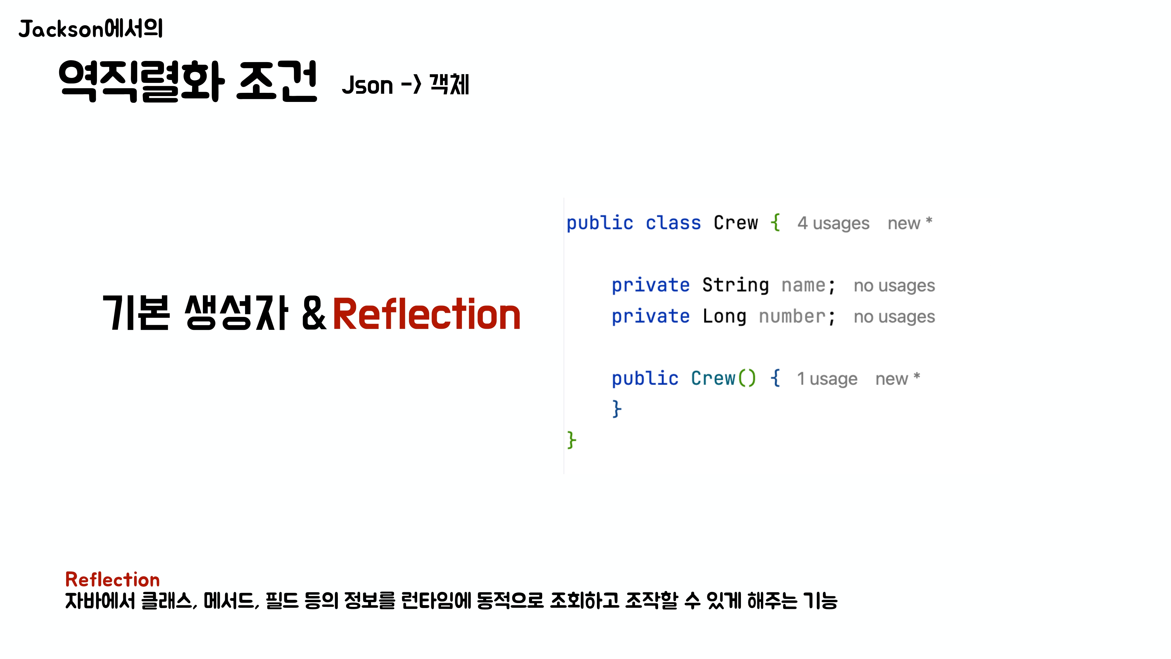 요즘 개발에서는 불변성을 중요시 여겨 setter가 없는 객체가 많다. 즉 setter가 없을 수 있다는 점을 고려하여 리플렉션을 허용한다.