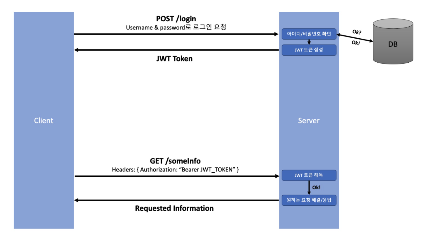 - 클라이언트가 HTTP 헤더(authorization 헤더)에 토큰을 담아 보낸다