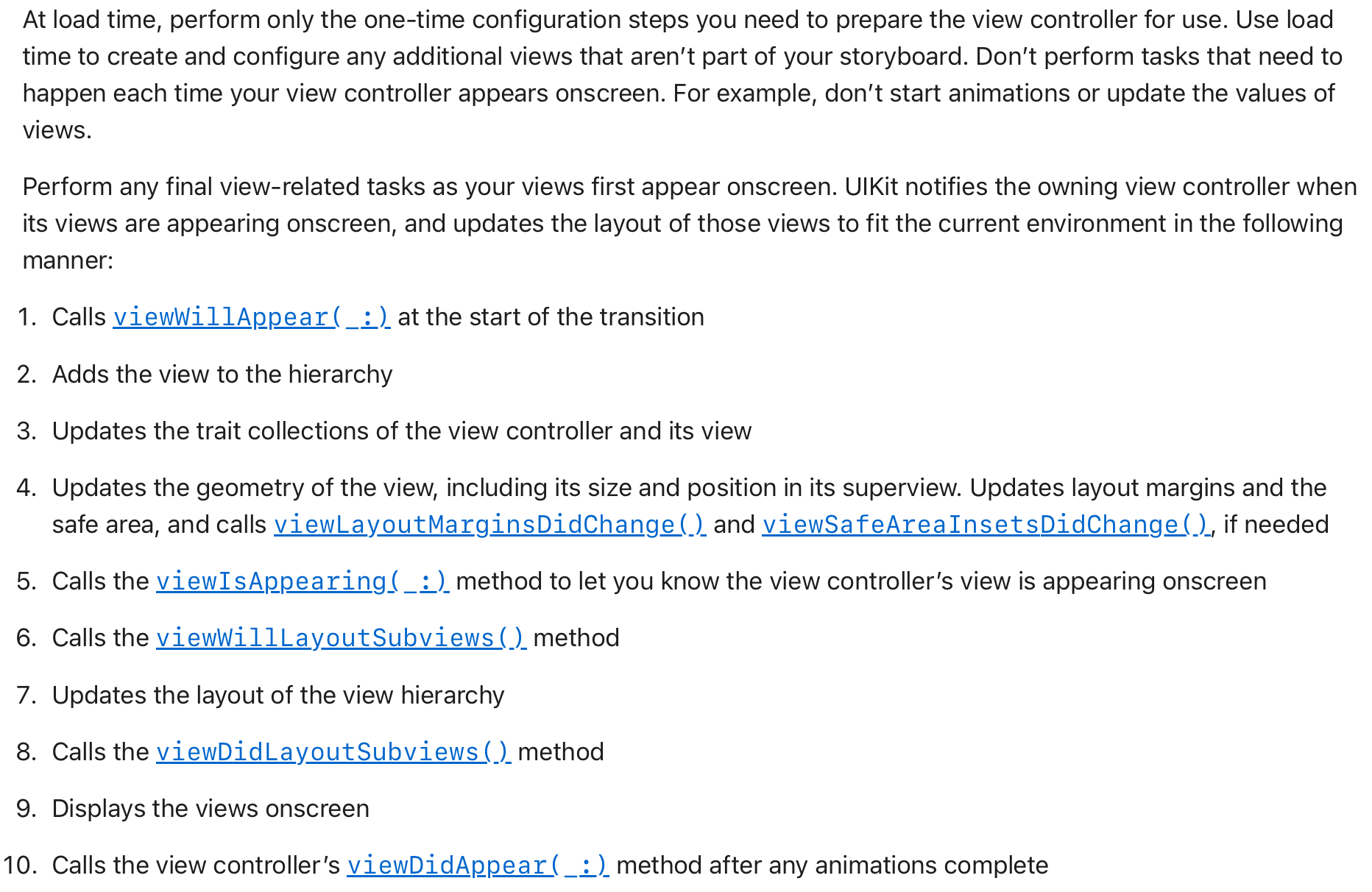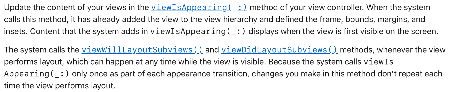 시스템은 뷰가 레이아웃을 수행할 때마다 viewWillLayoutSubviews() 및 viewDidLayoutSubviews() 메서드를 호출합니다. 이는 뷰가 표시되는 동안 언제든지 발생할 수 있습니다. 시스템은 각 모양 전환의 일부로 viewIsAppearing(_:)을 한 번만 호출하므로 이 메서드에서 변경한 내용은 뷰가 레이아웃을 수행할 때마다 반복되지 않습니다.