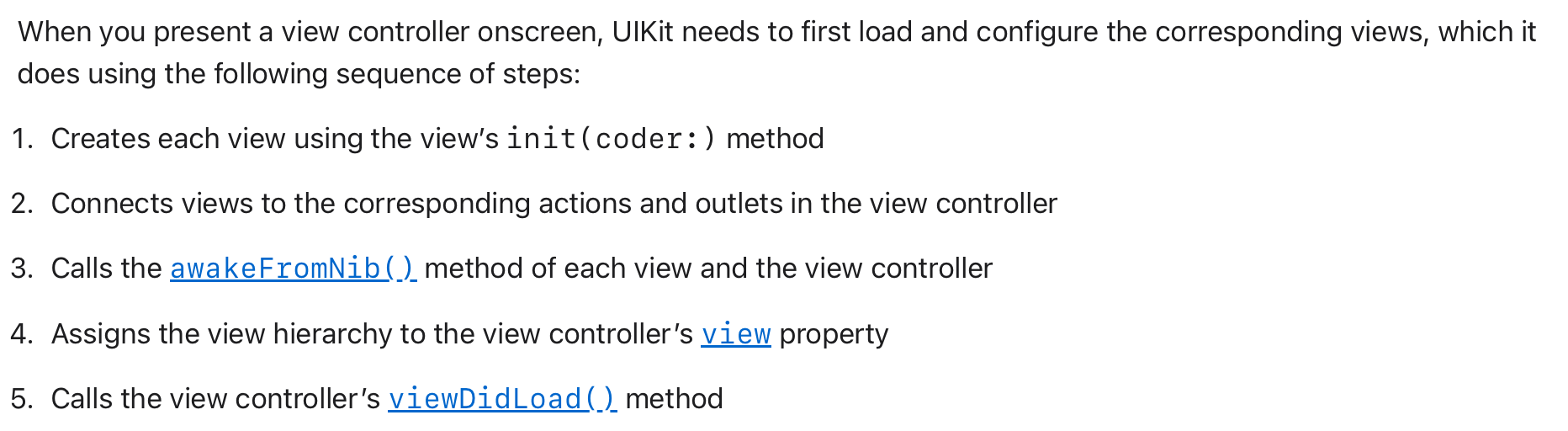 화면에 뷰 컨트롤러를 표시할 때 UIKit은 먼저 해당 뷰를 로드하고 구성해야 하며, 이는 다음 단계 시퀀스를 사용하여 수행합니다.