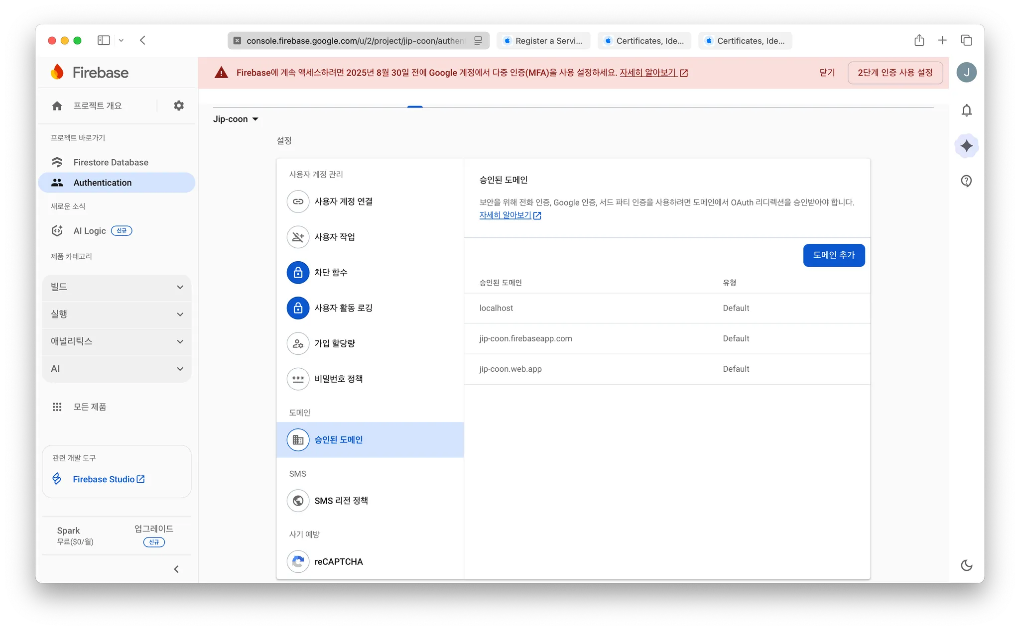 Firebase console - Authentication - 설정 - 승인된 도메인에서 확인 가능 (~~~.firebaseapp.com)