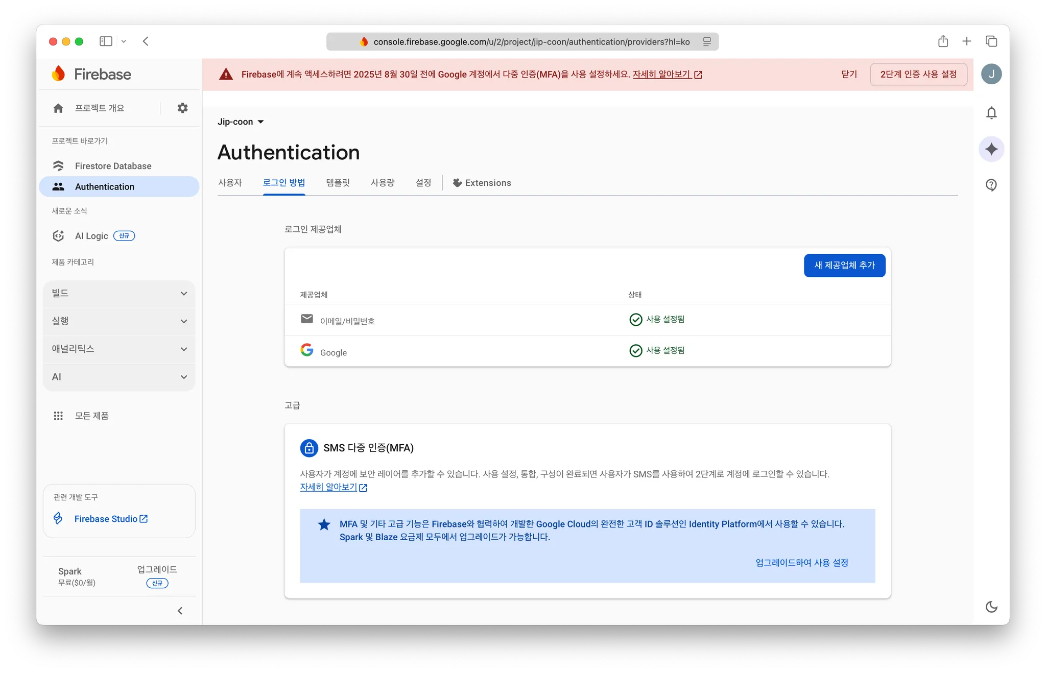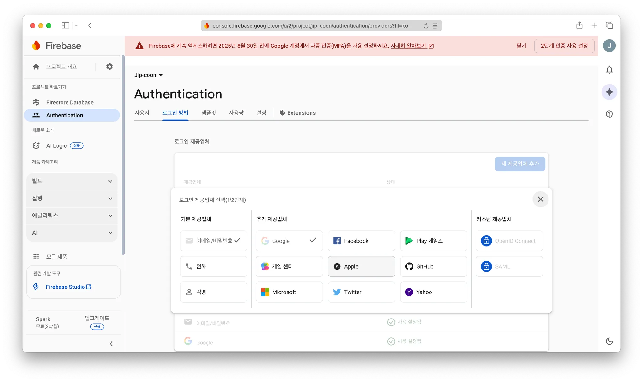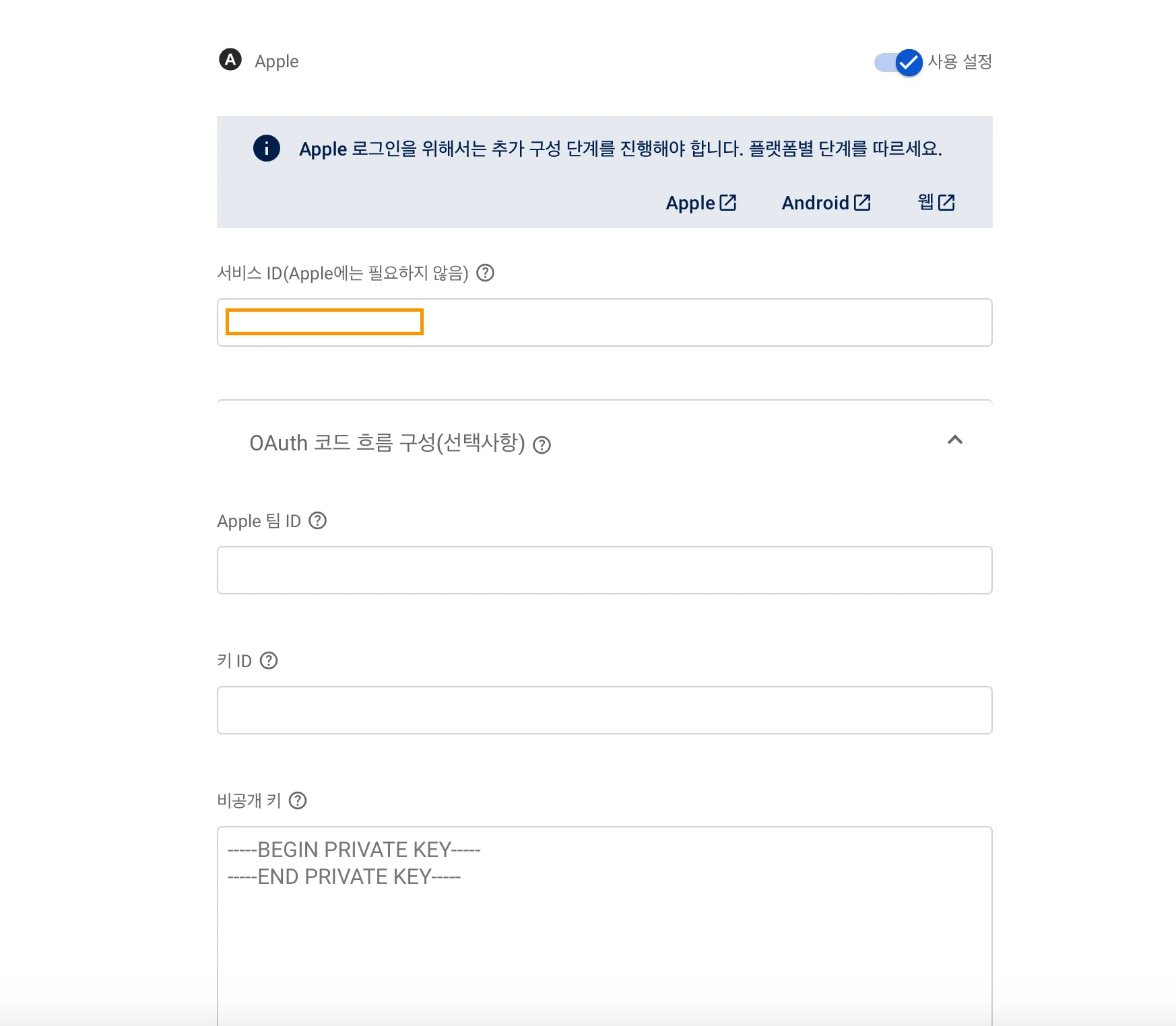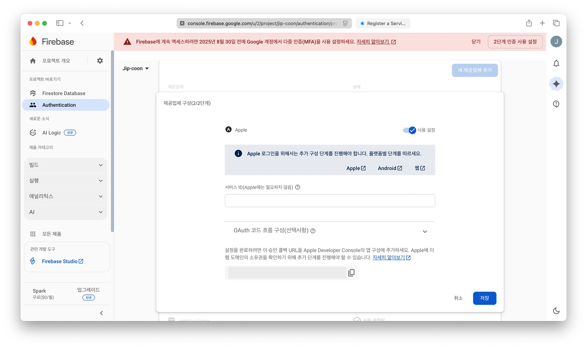 Firebase console - Authentication - 로그인 방법 - Apple 수정 - OAuth 코드 흐름 구성