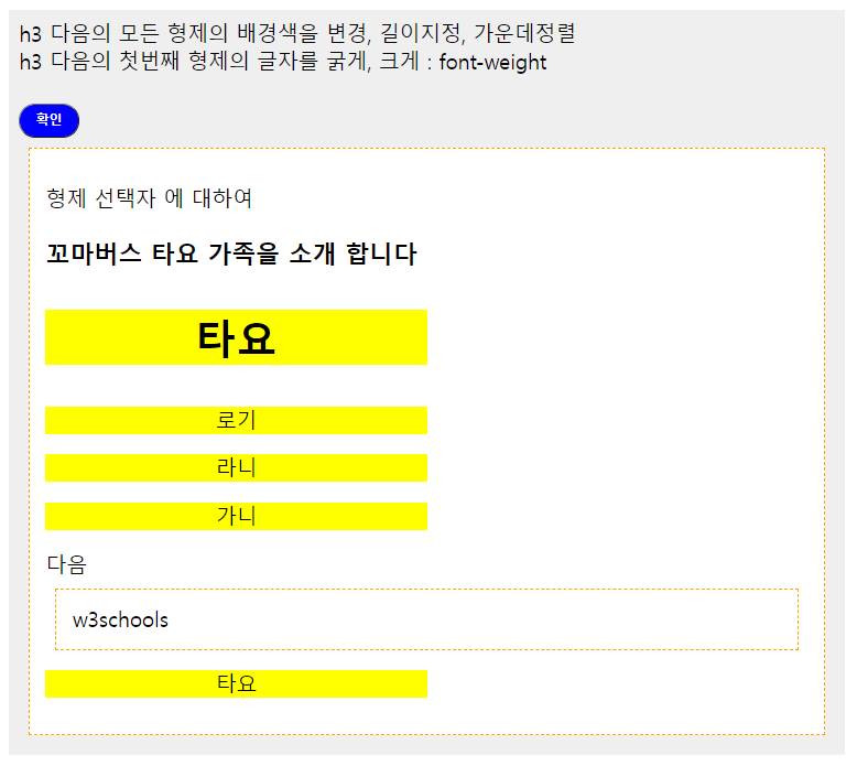 h3 다음의 모든 형제의 배경색을 변경, 길이지정, 가운데정렬<br>