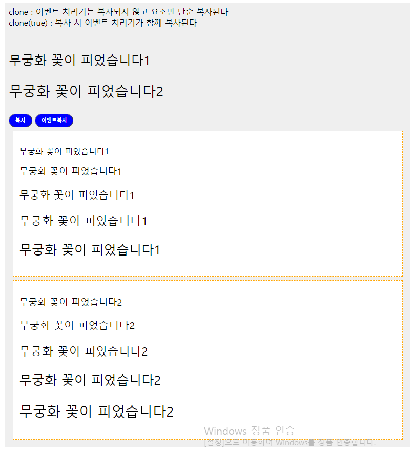clone(true) : 복사 시 이벤트 처리기가 함께 복사된다<br>