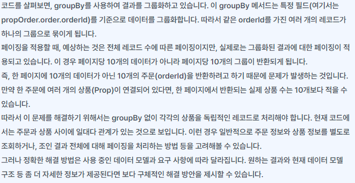 위와 같은 상태로 offset을 하게 되면, 10개의 데이터를 조회하더라도 offset의 기준이 groupBy가 적용되기 이전 데이터에서 잘리기 때문에 3개의 데이터가 최종 데이터로 조회 된다.