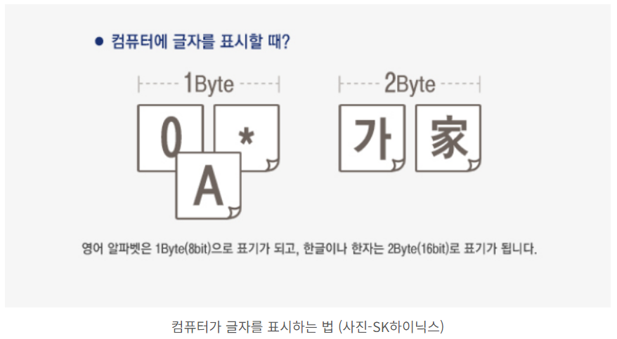 바이트(Byte)는 주소 지정이 가능한 단일저장소라고 부르며, ASCII 코드와 같은 데이터 문자를 표현