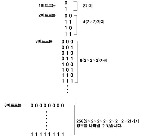 즉, 1바이트는 8개의 on/off상태를 조합하여 나타낼 수 있는 수는 총 256(2^8)가지가 되기 때문에 1바이트(byte)는 0부터 255 까지의 값을 갖게됨