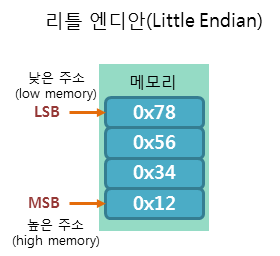 - 리틀엔디안 방식은 가장 낮은 유효 바이트(LSB, Least Significant Byte)를 가장 낮은 메모리 주소에 저장