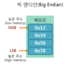 - ex. 4바이트 데이터 '0x12345678'이 있다면 메모리에는 순서대로 '12 34 56 78'로 저장