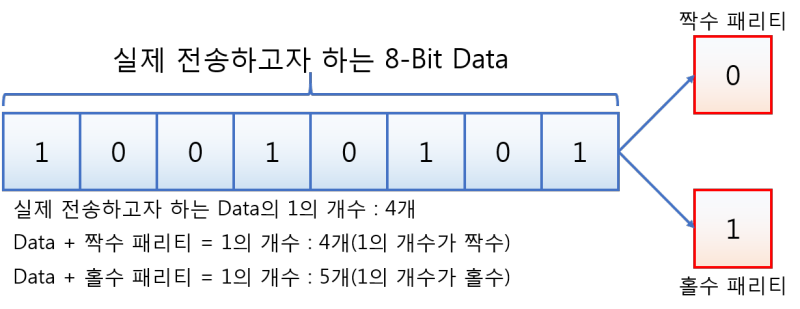 실제 전송하고자 하는 8bit data에 추가적으로 붙게되는 패리티 비트를 짝수 패리티로 설정할지 홀수 패리티로 설정할지에 따라서 붙게되는 패리티 비트값이 달라짐