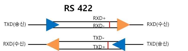 RS-422는 4개의 선으로 구성되어 전이중 통신 방식으로 데이터 송수신
