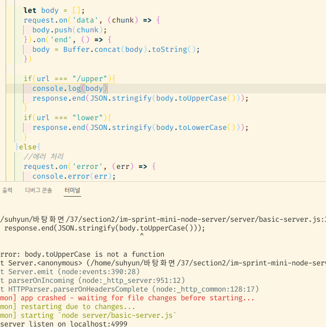 위 상태에서는 post 요청을 보내도 콘솔에 아무것도 찍히지 않는다. 왜냐면 요청이 끝났을때를 나타내는 request.on('end',...)구문 내에서 두개의 조건문을 써 줘야 하는데, 이렇게 작성했으니 당연히 body는 배열일 것이고, 에러가 날 수밖에 없는 거다.