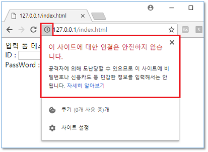 정상적으로 접속된다면 사진과 같이 주소 표시줄에 "안전하지 않음" 경고가 표시됩니다.