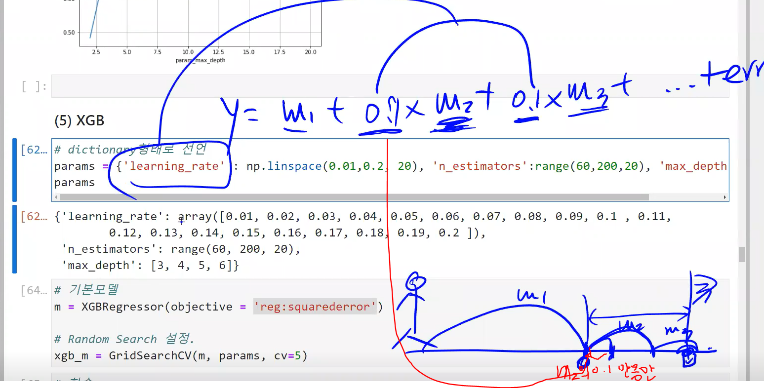 : 각 트리의 기여 정도를 조절. 0.1처럼 낮게 설정하면 앙상블을 train set에 학습시키기 위해 많은 트리가 필요하지만, 예측의 성능은 좋아짐