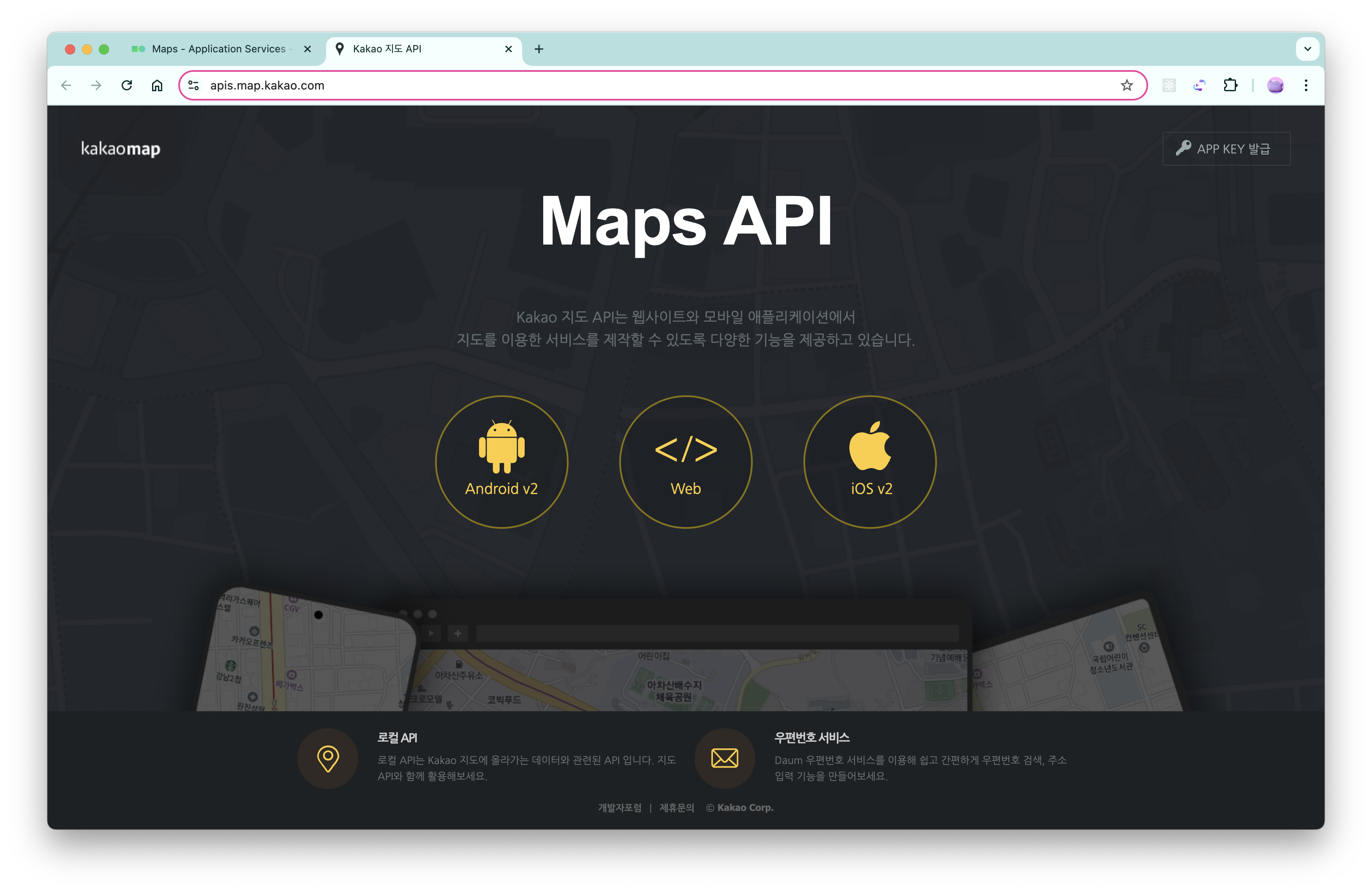 <script type="text/javascript" src="//dapi.kakao.com/v2/maps/sdk.js?appkey=(발급받은 API 키)"></script>