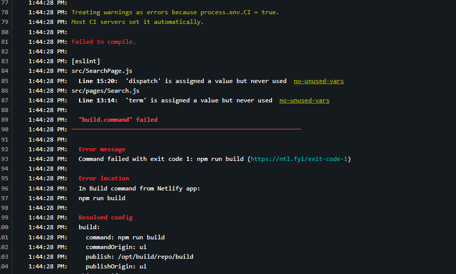 로그를 살펴보니 'no-unused-vars' 관련 경고 때문인 것을 알 수 있었다.