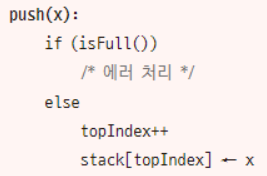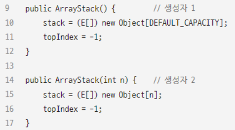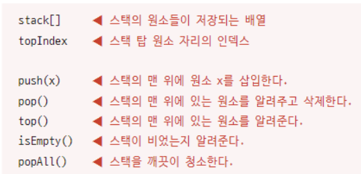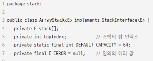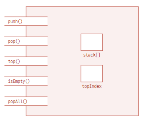배열 스택의 객체구조를 구현하기 위해서는 먼저 스택을 위한 배열과 스택의 맨 위쪽 원소의 배열 인덱스를 저장하는 정수가 필요하다. 그리고 그러한 스택을 다룰 수 있는 5가지 메서드가 존재한다.