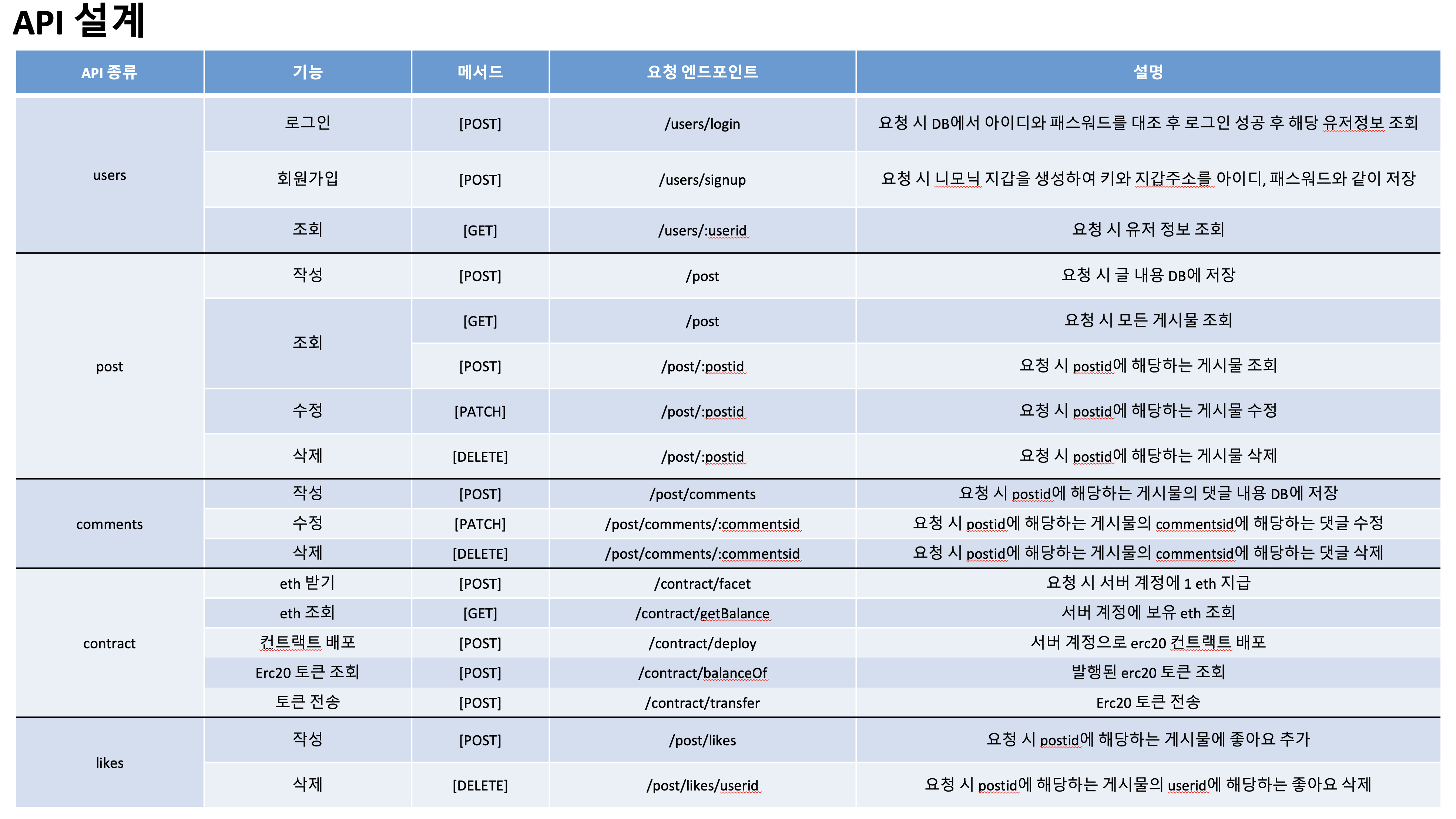 서버에서는 회원가입, 게시글 수정, 게시글 삭제, ORM 연결, 컨트랙트 관련 기능을 맡아서 진행하였다.