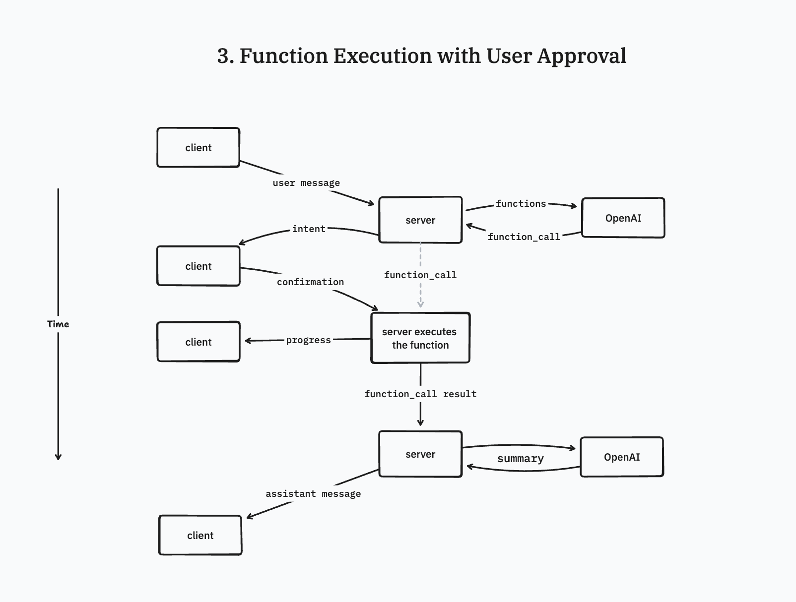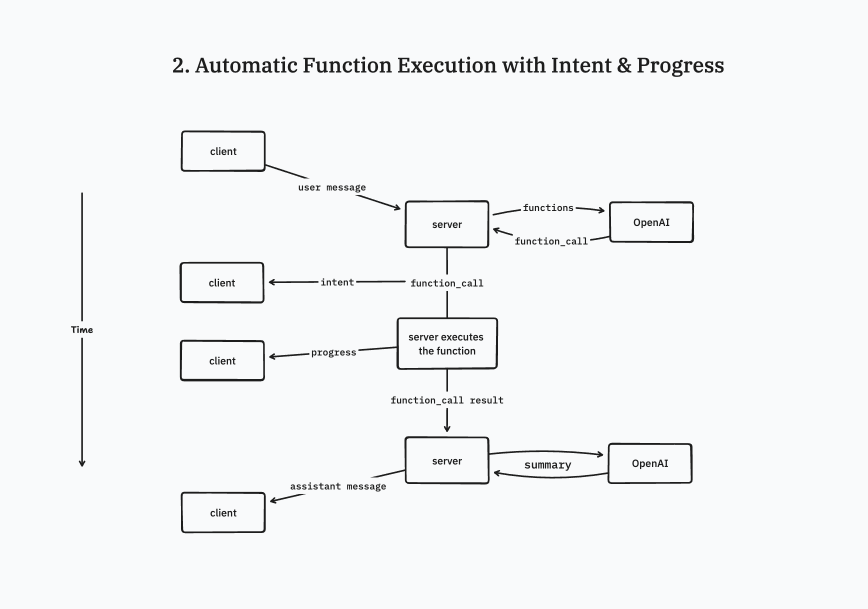 2. Automatic Function Execution with Intent & Progress 와 거의 유사하지만 차이점은 function_call 과정시에 사용자의 의도를 기반으로 함수 선택 및 확인 후에 서버에서 함수를 실행하게 되는 차이점이 있다.다음처럼 3가지 UX Flow를 따르면서 사용자 경험이 확대된다. 이는 프롬프트를 어떻게 작성하느냐에 따라 UX Flow를 선택할 수 있을 것이다. 가령 예시는 다음과 같다.