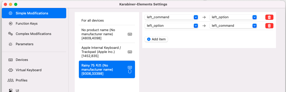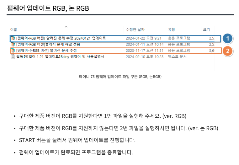 | Fn+Tab | 연결모드 변경 ( ESC - 유선 / F1~F3 블루투스 / F4 와이파이 ) |
