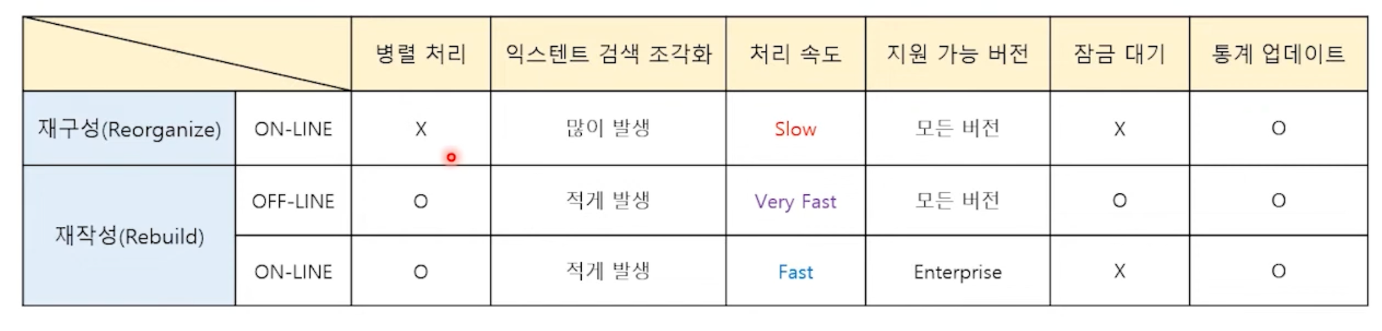 - 인덱스 재구성 : 조각난 인덱스의 페이지를 읽어내면서 물리적으로 재 정렬한 후 비워진 페이지를 반환